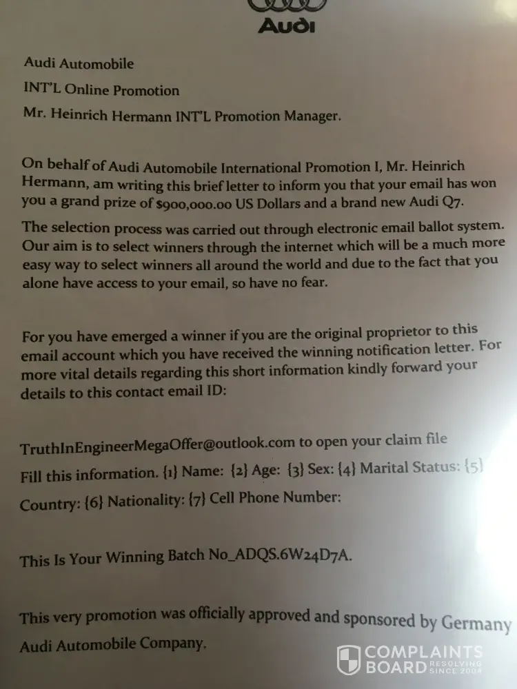 I sent a file which came from a PDF which this file look professional but not legit after I sent him informations about me about the prize ….