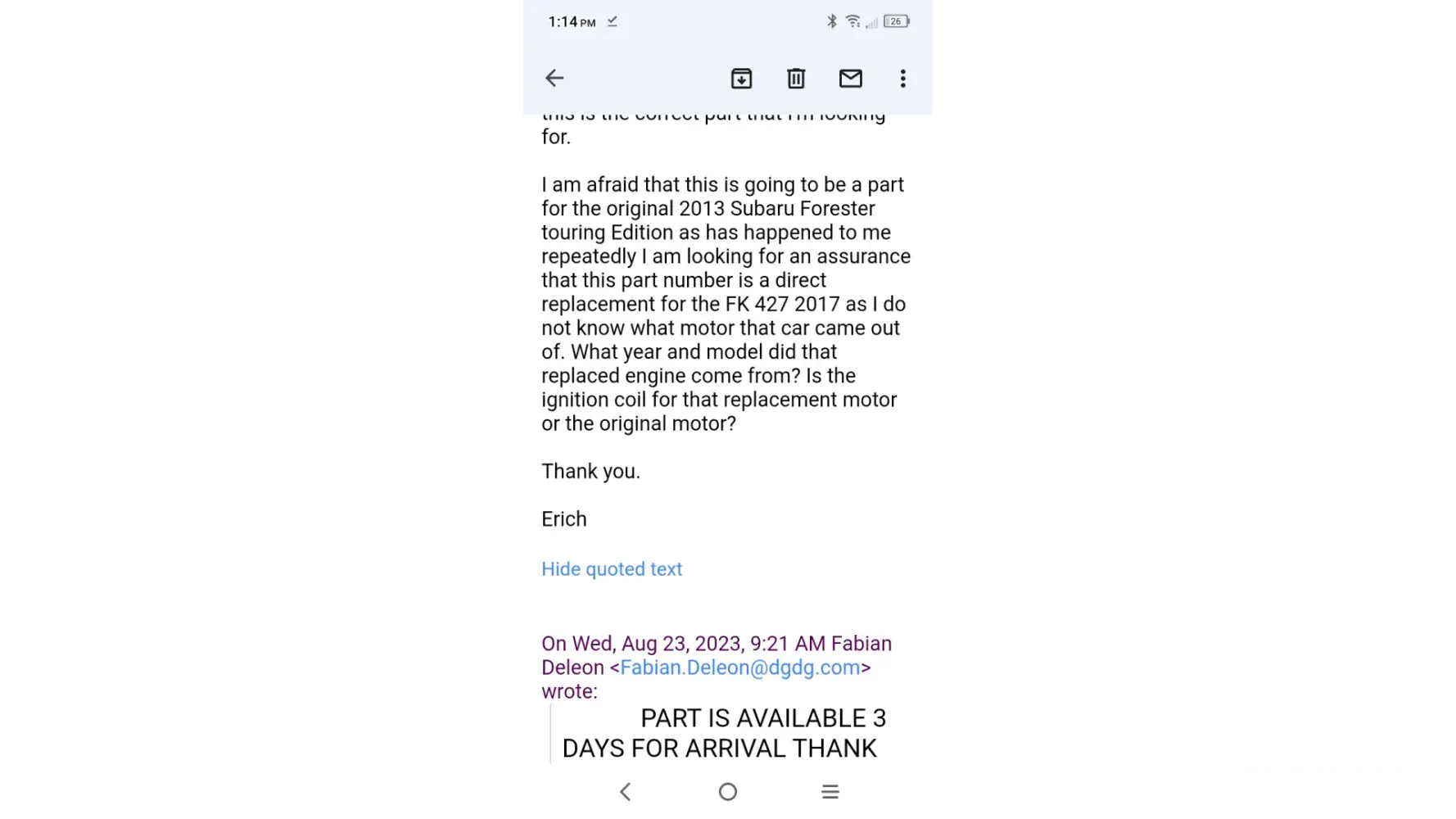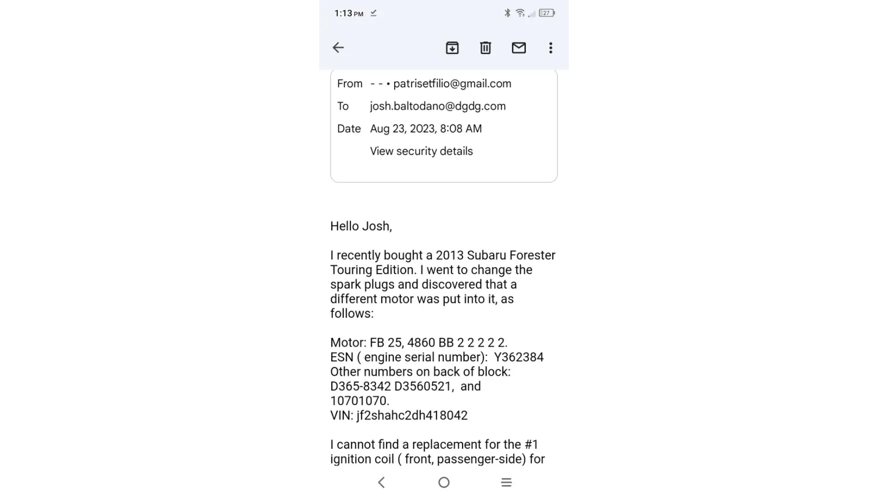 The motor on a 2013 Ford service changed out with something different and the ignition coil ordered for the replacement motor does not fit every rep that I speak to does not understand it is not the same motor and I sent ample identification information but no rep will think and they keep entering 2013 Subaru Forester and... The wrong part... I need somebody that can actually think to research the part number.