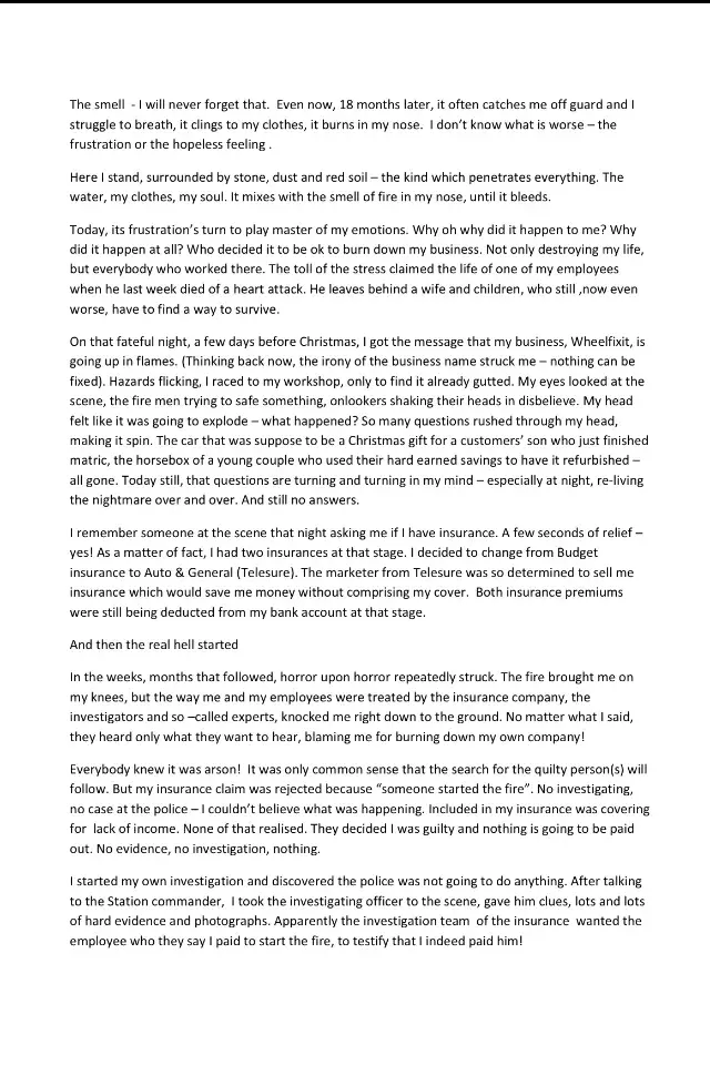 In the weeks, months that followed, horror upon horror repeatedly struck. The fire brought me on my knees, but the way me and my employees were treated by the insurance company, the investigators and so -called experts, knocked me right down to the ground. No matter what I said, they heard only what they want to hear, blaming me for burning down my own company!
