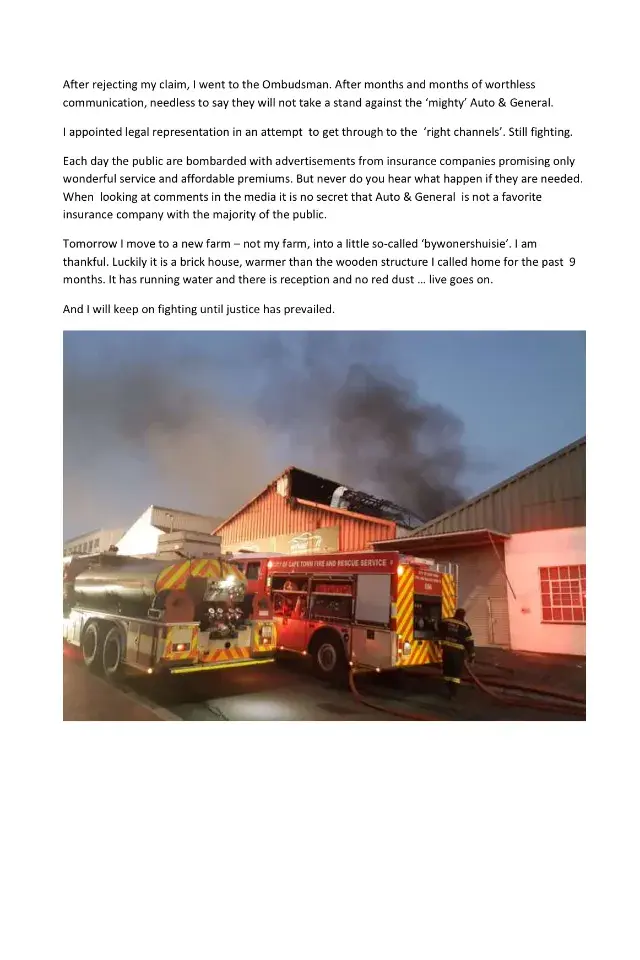 Everybody knew it was arson! It was only common sense that the search for the quilty person(s) will follow. But my insurance claim was rejected because "someone started the fire". No investigating, no case at the police - I couldn't believe what was happening. Included in my insurance was covering for lack of income. None of that realised. They decided I was guilty and nothing is going to be paid out. No evidence, no investigation, nothing.