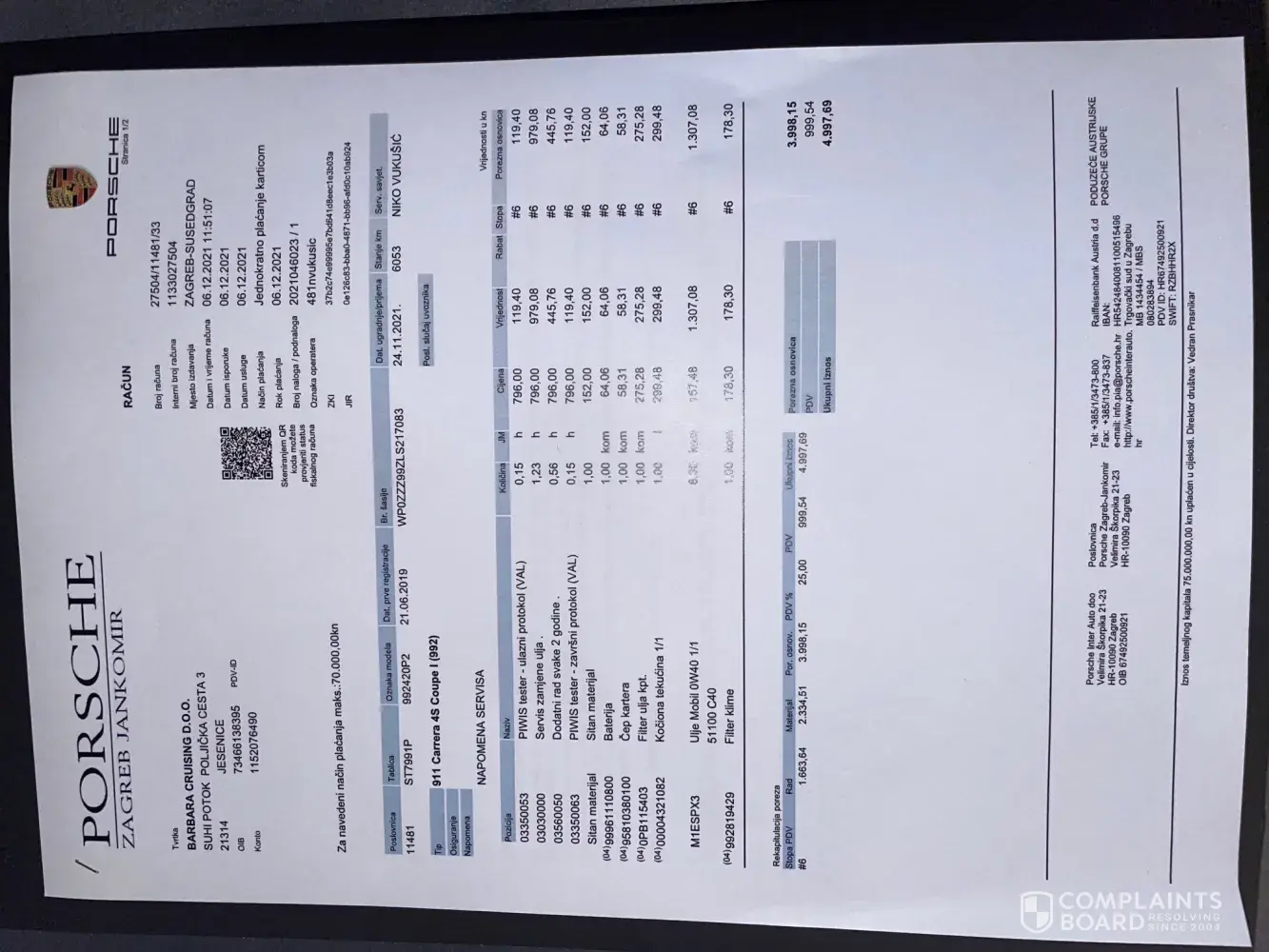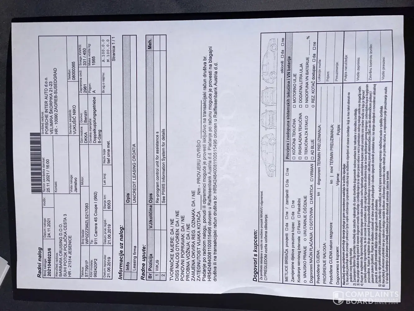 I am owner of the car Porsche 911 Carrera 4S Coupe I (992), serial number WP0ZZZ99ZLS217083. Car is purchased and taken in your suppler company in Split (Croatia) on 19th June 2019. After two years, on 24th November I have arranged service in Porsche Zagreb and transported car in own arrangement. Before coming to service in Zagreb I received advice that the...