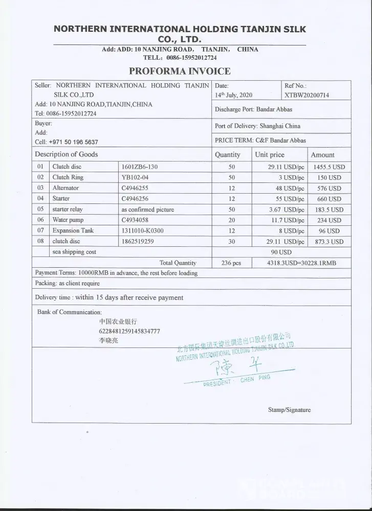 1) The following company, has contacted us, to sell us, clutch discs: Xingtai Brave Auto Parts Co., Ltd. No.119, Dongguan Street, Qiaodong District, China 2) The mentioned company sent us the below proforma Invoice: 3) The full payment has been send, to the personal account of the company. 4) The seller shipped us the wrong clutch discs, with low...