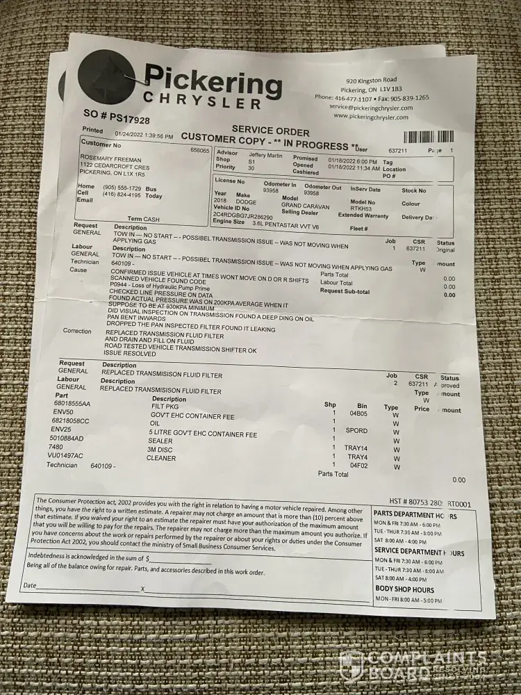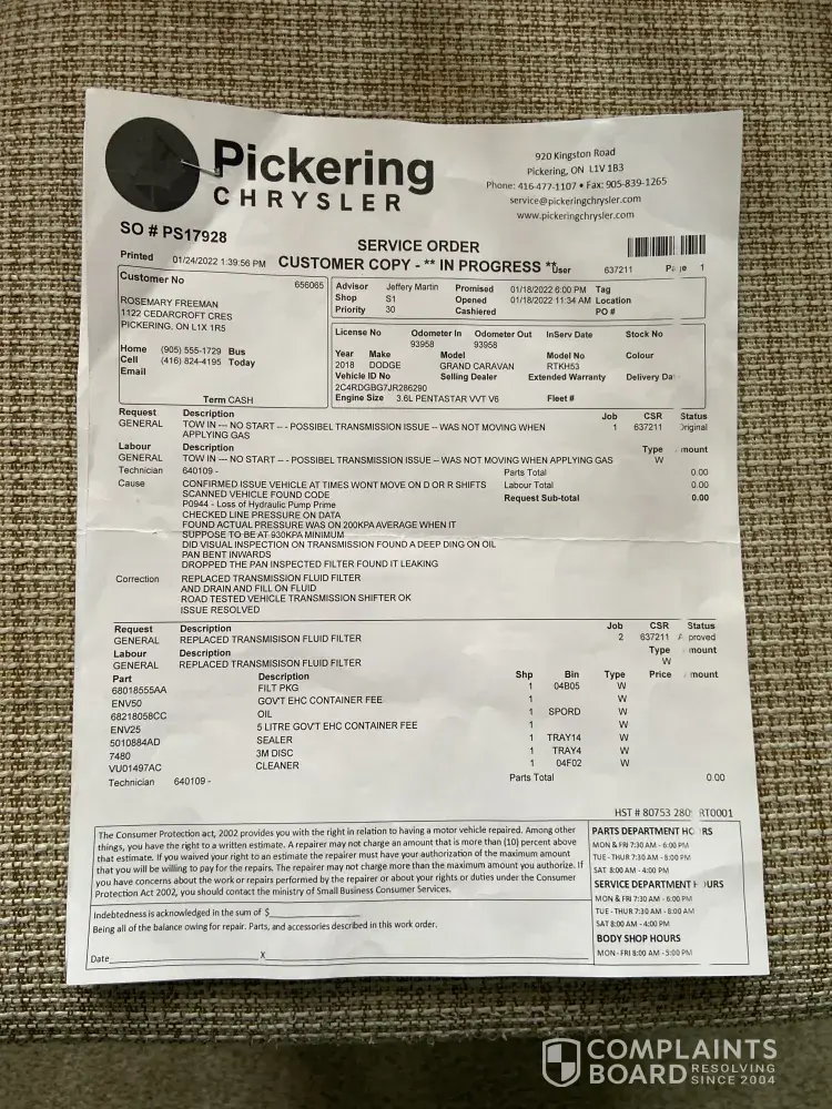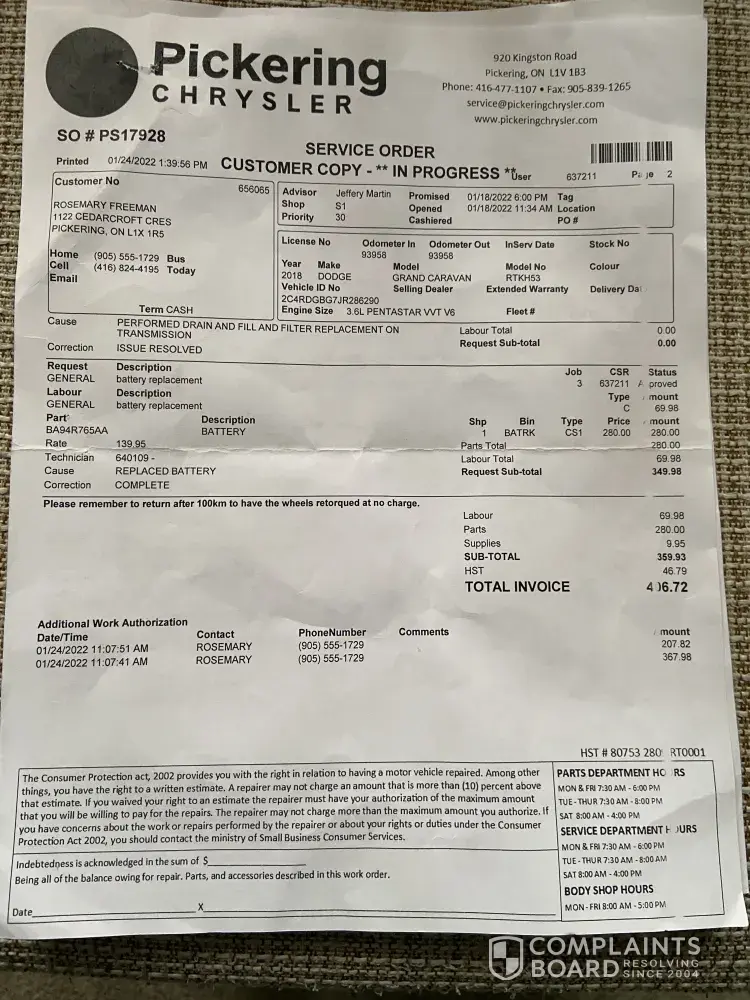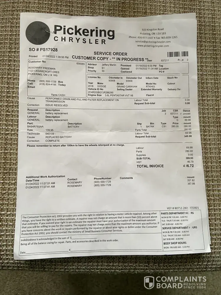 Read full complaintPickering Chrysler - Trans repair and false battery sale