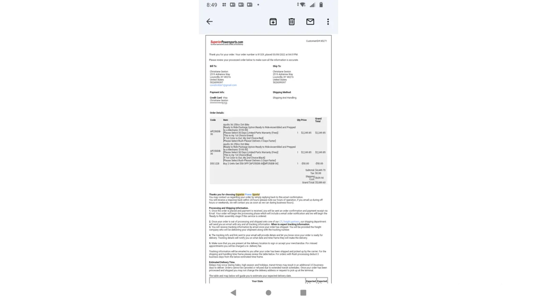I ordered 2 Db36 dirt bikes with the ready to ride package for 5,000 plus dollars and never received the bikes my kids were devastated they charged my account so I tried calling and was told that they don't except orders for that much and they stopped answering after I sent a pic of the order confirmation and we never got our money back or the bikes very hurt by this company financially and mentally