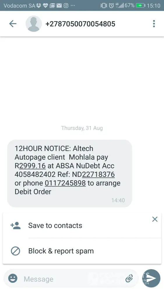 The following number send me twice a threatening sms about an outstanding bill for r 60. 00 that does not exists.