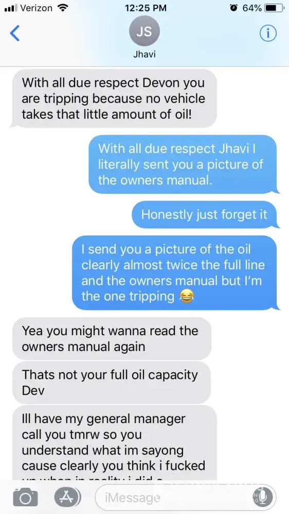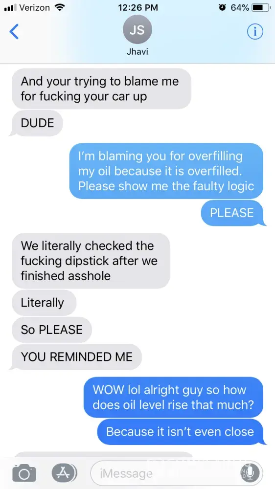 An employee at an auto zone store on East Market Street in Leesburg, Virginia offered his help to me two sundays ago in changing my oil and replacing my oil filter before I went back to school at William & Mary. After leaving the oil change performed solely by Mr. Schatz I noticed a char or almost burning smell when I turned my car on which I wrote off as being part of the 50-100 miles he recommend I run the car to lubricate the engine. Upon getting to school almost 200 miles later the problem was still there so I called my brother-in law who is a mechanic who said to check my fluids when I noticed I was massively overfilled with oil. I had texted Mr. Schatz about it to which I was met with an intensely defensive posturing, name calling, blame and public lies to my peers. I have attached screenshots of our message conversations as well as the dipstick reading and wholeheartedly do not believe autozone believes the manner in which I was dealt with was professional, warranted, or mature. For my character to be attacked by an employee due to me bringing up a specific issue about my vehicle that he had worked on is wholly unacceptable. I hope I can speak with someone further about this and ensure that this isn't the kind of employee you want representing your company.