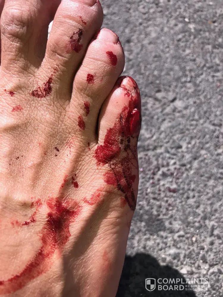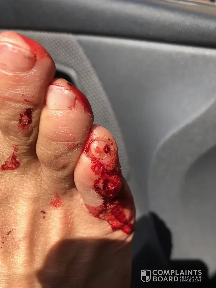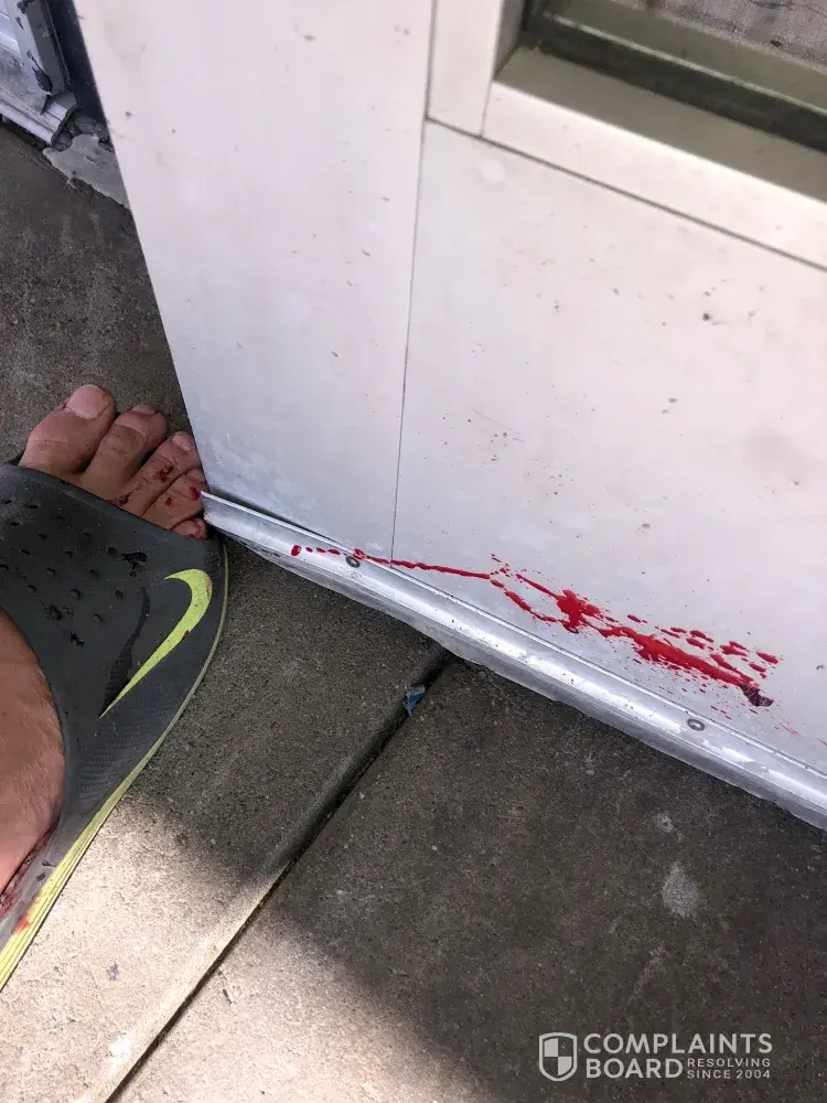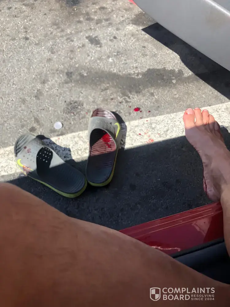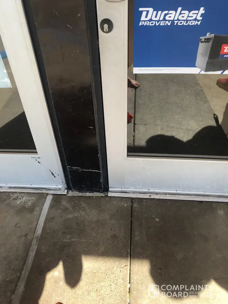 I was april 24, 2018 around 2:30pm-3:15pm when I went into your store have my battery checked to see if I needed a new one... Had it tested by one of your employees and battery checked no good, so went back in to buy a new one and paid for it... Than changed my mind and had charges credited back to my card and went back out to my car and I started talking to a guy that overheard what I was explaining to your employee what the problem was with my car and he made sence of what the problem was with my car... And yes... He said that battery was old and needed a new... So I went back in to the store to purchase the battery and as I was opening the door (it was a nice sunny day and was wearing sandles) I felt something hit my foot and did not pay much attention to it at the time when I went in and purchased the battery and did the transaction and took the new battery out to my car to install it and that's when I felt something wet in my foot, so I looked down and it was all blood, I was bleeding a lot... I had cut my small toe on my right foot very bad at the bottom of your door (the door thats marked "in" that is) where the flashing is, which has deteriorated worned out into a very sharp like knife object at the bottom left edge of the door.. Very dangerous, it happened to me it can happened to someone else, and did not recieved any help from your employees.
