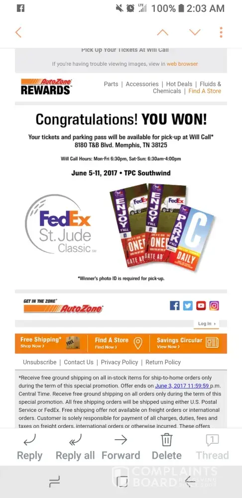 I have tried to contact autozone a couple of times without having a response at all. I received a email saying that I won tickets to the st Jude golf in Memphis Tennessee June 5th to the 11th 2017 and upon arrival there were no tickets available for me whatsoever. I took off work and basically wasted my vacation time. If someone could please contact me and try to resolve this issue please [protected]@gmail.com