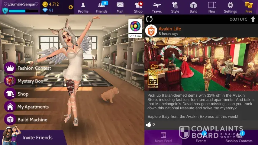 I am complaining about how I have NOT received my accounts from Avakin Life. Once I leveled up to lvl 20 they said I received my 1, 000 avacoins reward but it would show, so I contacted the services. Then today my bf sent me a bear as a gift and it DIDN'T show in my inventory. Also TODAY a few hours later when I came back online for The Egypt Adventure when I opened the box and they said I got 15 avacoins as a reward but yet again, they wouldn't show! PLZ FIX THIS GODDAMN BUG! :(
