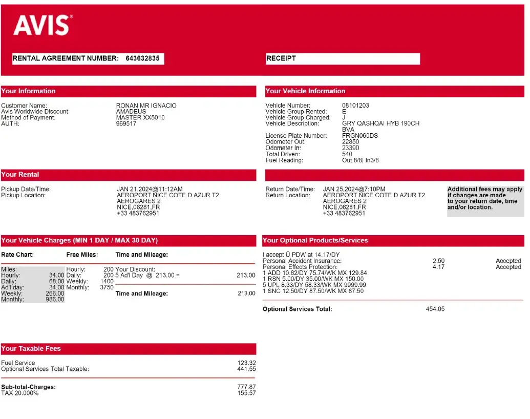 I rented a premium car from Avis at Tweed airport on November 2nd, 2023..