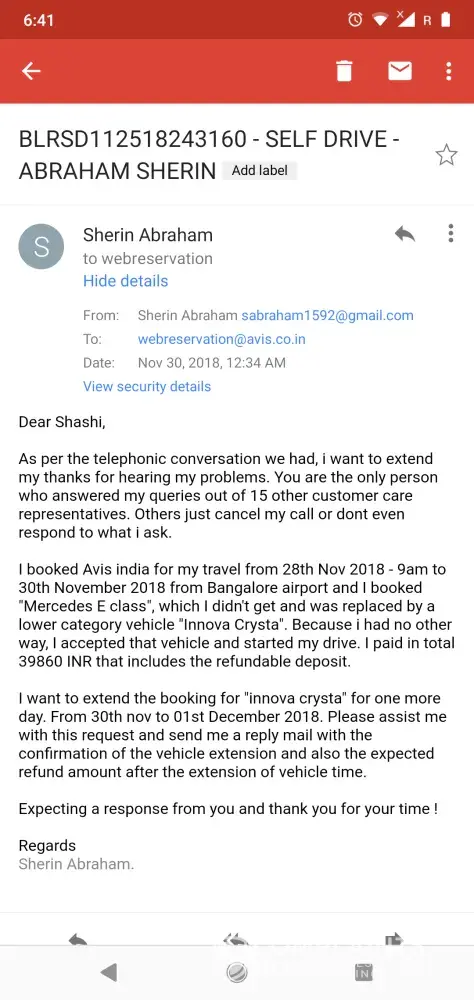 Fraud App...fraud people.. never use avis india ..unless u have lot of money to waste. I booked mercedez benz e class for my travel and at the last monet they said car is not available and replaced with an innova crysta after i paid a total of 39860 INR. NO proper customer care... They say about a 24*7 dedicated line which will never connect your call to any executives..no email reply when they say max time of reply is 4hours. Such a pathetic experience. I called many times and at last i spoke with a person ...still nothing is sorted and please never support this kind of rentals. If u have any doubt about this details you can contact me at [protected]. I have all the call records and the emails i sent with no reply from car rental avis india