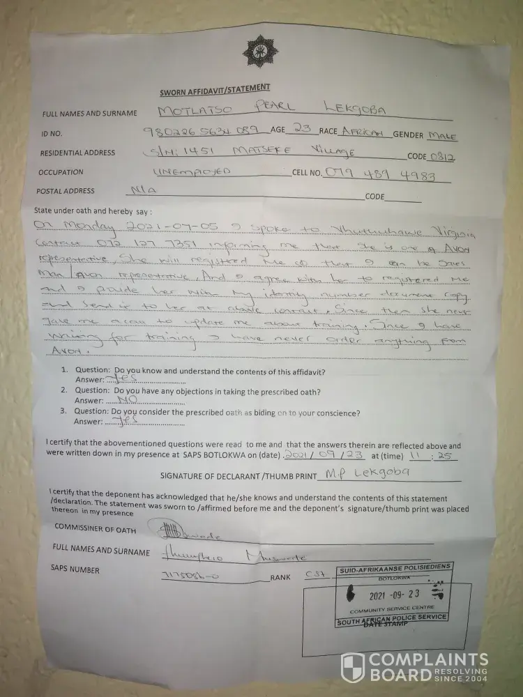 Someone opened Avon account without my knowledge and made an order I didn't know this was a serious issue until I got a call and massages saying that I owe Avon R900 please assist me clear my name and close the account thank you