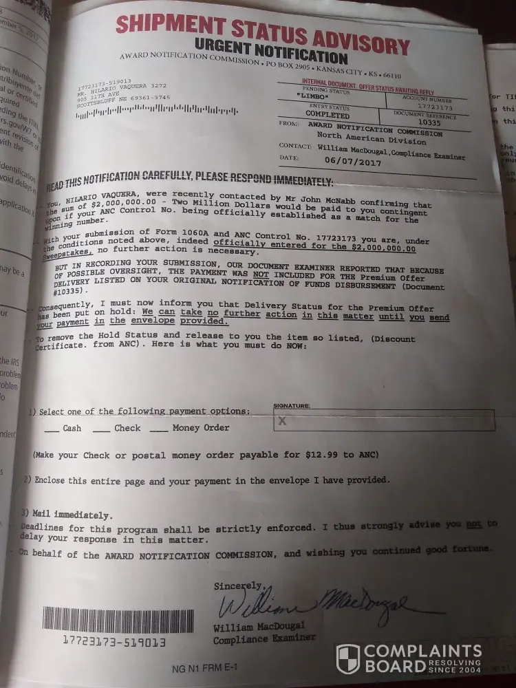 Document Reference: 10335 From: Award Notification Commission, North American Division Contact: William MacDougal, Compliance Examiner Date: 05/31/2017...Possible oversight the payment was NOT included for the Premium Offer Delivery listed on your original notification of funds disbursement (Doc#10335) blah blah..'I am on hold: Need to make payment of 12.99 payable to ANC.. Check/MO. Must do now; Select one of the following payment options 1. Cash 2. Check 3. Money Order (Box for signature)Enclose this entire page and your payment in the envelope 'I' have provided. Immediately! Deadlines strictly enforced. Strongly advise you NOT to delay response in this matter. On behalf of the ANC, and wishing you continued good fortune. Sincerely, William MacDougal, Compliance Examiner WHO THE HELL ARE THESE PEOPLE? How many fall for this? One million people times 12.99 is lotssss of money! Glad and happy to send my message to you. Received one (1) prior letter from ANC, but disregarded. This second letter valid at first glance, but doesn't take a rocket scientist to understand...(Please send $12.99) Doesn't state why. Sending original with their return envelope. Thank you for the opportunity in writing you. Mrs. Rosemarie Pandiscio 6311 Ventura Ct. Plainfield, Il. [protected]
