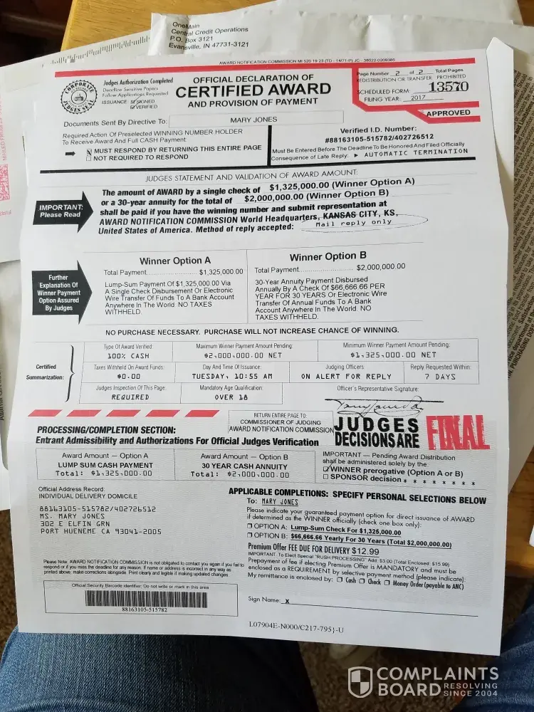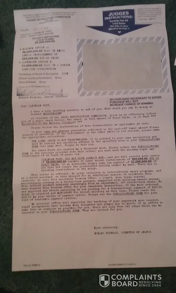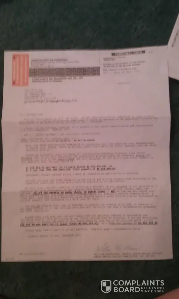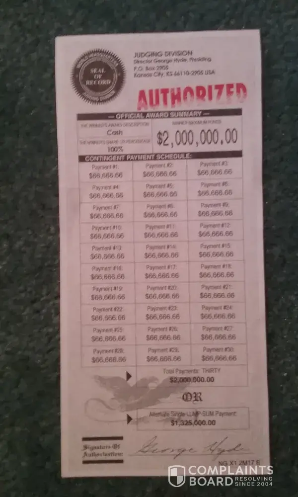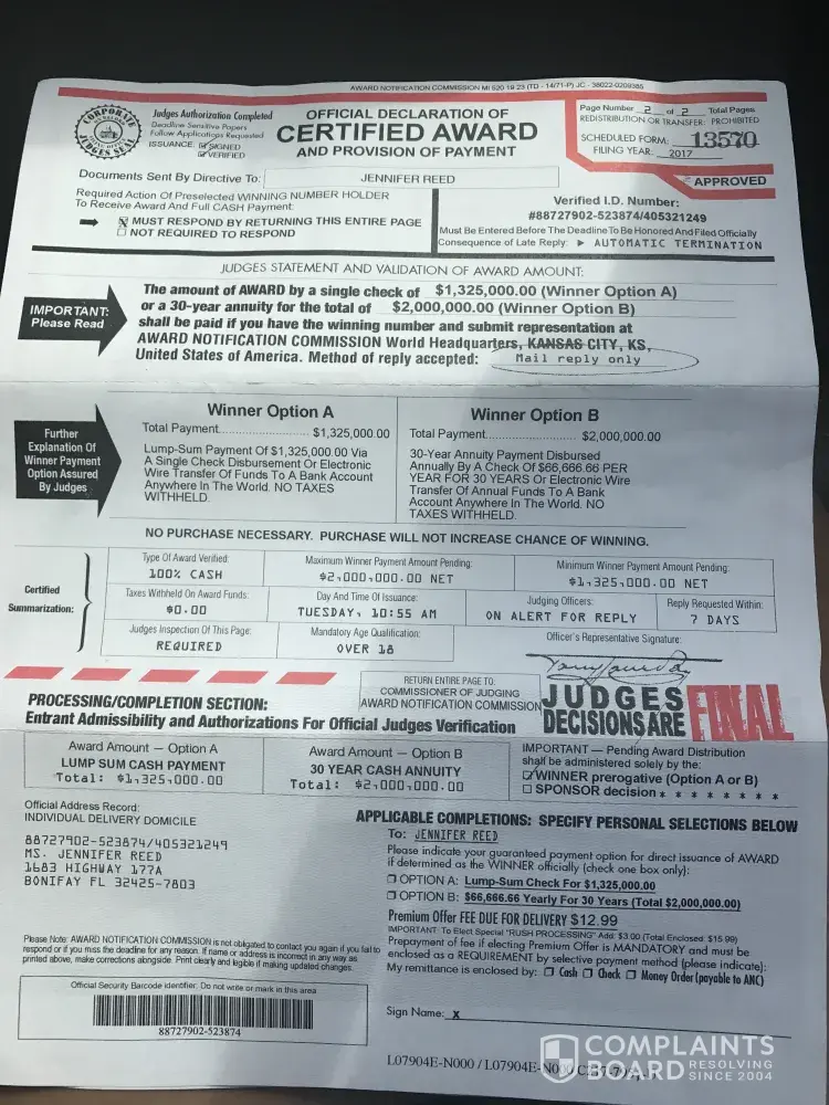 I have received an executive judging panel award determination and official processor letter in the mail. And it's claims that I have the winnings pre-selected winning number and it has been identified as a match for pending payment of a 2 million-dollar award. Is States that this letter seeks to verify my ID reference number for the actual award opportunity so stated and verified in negotiable cash funds It also says that this is not a mistake and the dispatch of this direct communication is your official advisement from the operational headquarters of the ANC an international sweepstakes organization located in Kansas City KS United States of America. And what it also says is that we request that you come forward at once bY returned mail. The letter also reads that your judges must inspect my attached ancient determination document to coordinate formal record of my name and delivery address then it says please note if you return this document by the deadline it would be your privilege to honor my selection of payment of the award funds either an annuity paying me $66, 666.66 per year for 30 consecutive years total 2 million dollars. Or an alternate payment of lump sum Cash of 1 million $325, 000 dollars. says this is a large cash award all requested instructions for your completion are specified on the attached page numbers one through three. Then it also says there are no further levels or stages of completion subject to this major award series. In the last paragraph it says please return your completed entrant determination document at once the entire attached page must be returned for the judges inspection and official record return the form and your pre selected winning number so our judges can confirm and validate my pre selected winning number. As winner you will receive the full cash award without exception. By LAW we must pay you. The time for excitement is now. The total amount of grand prize is ($2, 000, 000.00) our office is anxious to proceed and once again congratulations. Signed by Mr. Morley Smith, Director Of Awards.
