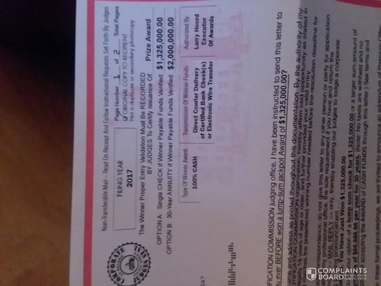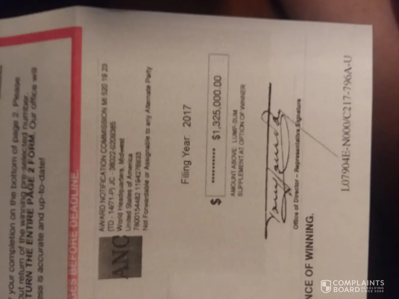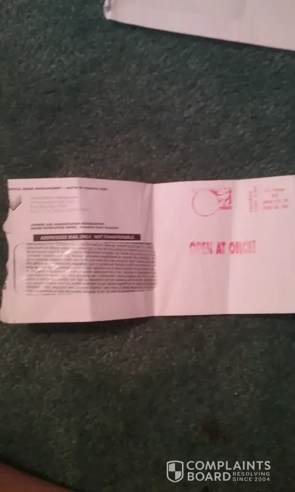 I have received an executive judging panel award determination and official processor letter in the mail. And it's claims that I have the winnings pre-selected winning number and it has been identified as a match for pending payment of a 2 million-dollar award. Is States that this letter seeks to verify my ID reference number for the actual award opportunity so stated and verified in negotiable cash funds It also says that this is not a mistake and the dispatch of this direct communication is your official advisement from the operational headquarters of the ANC an international sweepstakes organization located in Kansas City KS United States of America. And what it also says is that we request that you come forward at once bY returned mail. The letter also reads that your judges must inspect my attached ancient determination document to coordinate formal record of my name and delivery address then it says please note if you return this document by the deadline it would be your privilege to honor my selection of payment of the award funds either an annuity paying me $66, 666.66 per year for 30 consecutive years total 2 million dollars. Or an alternate payment of lump sum Cash of 1 million $325, 000 dollars. says this is a large cash award all requested instructions for your completion are specified on the attached page numbers one through three. Then it also says there are no further levels or stages of completion subject to this major award series. In the last paragraph it says please return your completed entrant determination document at once the entire attached page must be returned for the judges inspection and official record return the form and your pre selected winning number so our judges can confirm and validate my pre selected winning number. As winner you will receive the full cash award without exception. By LAW we must pay you. The time for excitement is now. The total amount of grand prize is ($2, 000, 000.00) our office is anxious to proceed and once again congratulations. Signed by Mr. Morley Smith, Director Of Awards.