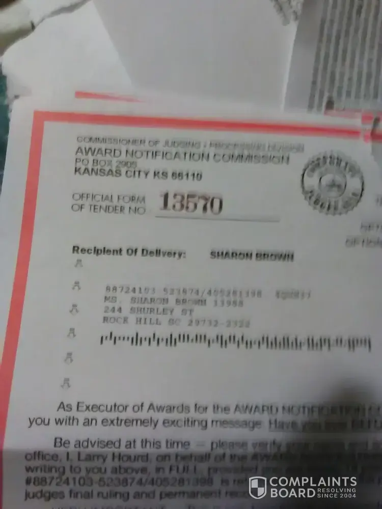 I to got the letter from ( Award Notification Commission - 2000000.00 winner) But did not trust it to be true so I did nothing. So decided to check them out Sorry to here that so many GOOD people fell for it> I do wish to thank all of you for letting others know AND I hope you all can sue and put the scammers in jail were they belong. Please try the BBB. and the attorney general as well as your congress person I wish you luck and hope they go down.
