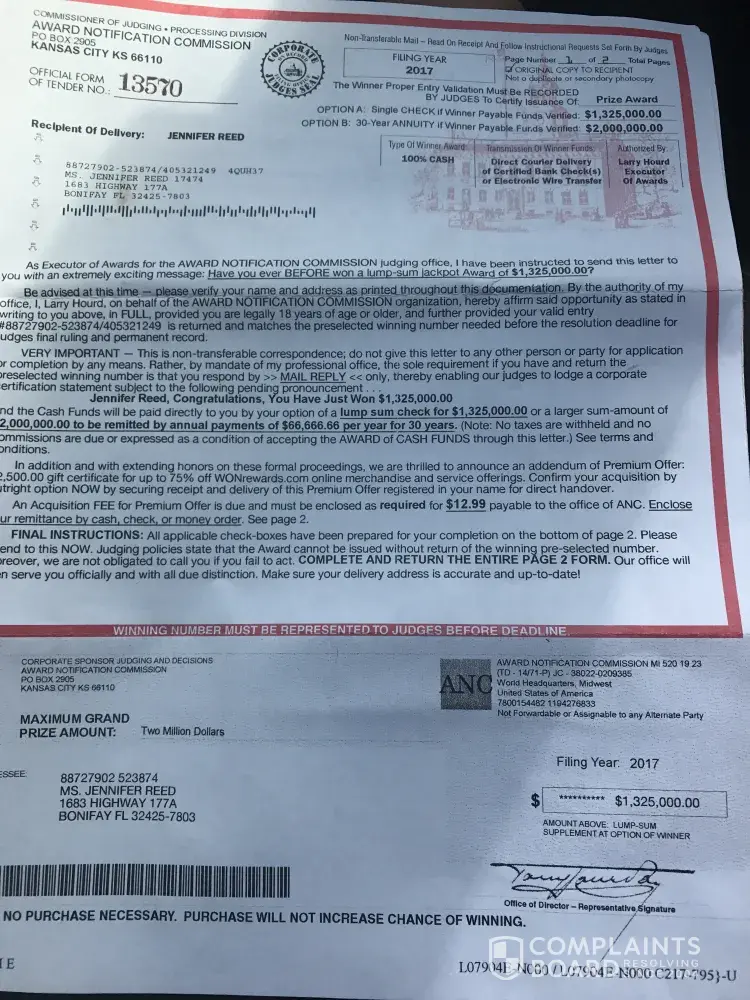 Letter saying I won two million dollars send 12.99 dollars to anc supplement at option of winner amount above $1, 230, 946.00 filing complaint would like my 12.99 money order back for leading me to a fraudulent thing Deborah Ann Dorrington. Has been sending me letters for years and my daughter issuing checks that look real and saying redeem at Federal Credit Union in your area. I think if this is a fraudulent company it should be caught and we should at least receive money order money sent in They sent a check to my daughter for 1500.00 dollars.They say the money I won would be delivered by an direct courier delivery of certified bank checks or electronic wire transfer Larry Hourd Executor of awards. Type of winning award cash 100% valid entry # [protected]-465565/[protected] Deborah Dorrington, Congratulations, you have just won $1, 230, 946.00 and cash funds will be paid directly to you by your option of a lump sum check for 1, 230, 946.00 or a larger sum-amount of 2, 000, 000.00to be remitted by annual payments of 66, 667.00 per year for 30 years. note no taxes are withheld and no commissions are due or expressed as a condition of accepting the award of cash funds through this letter.