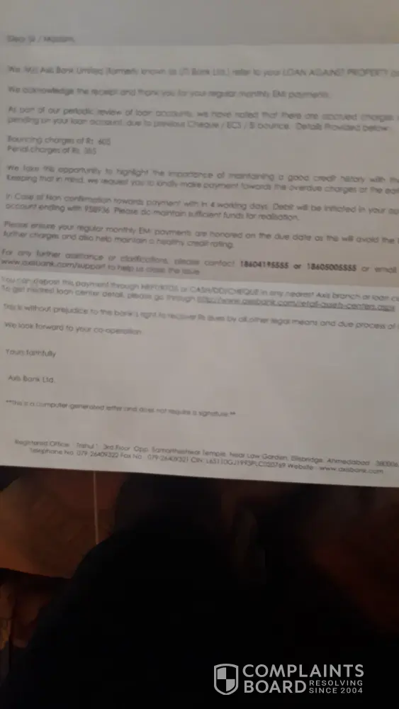 This is regarding axis loan account LPR020900712603. I received a notification that the cheque against my loan account has bounced. But throughout the year my account had sufficient balance. I went to the local Chidambaram Axis bank branch to inquire. They redirected me to Cuddalore axis branch. From there I was again redirected to Pondicherry bank branch. When I reached the final destination, the officials said that the cheque has not bounced and its a technical issue at their end. Since then axis bank employees have been coming to my residence to collect the EMI amount & I have been paying them through cheque. Despite all these, I have got a notice to pay Rs.960 as bouncing & penal charges. As a customer who regularly clears the EMI, I'm deeply frustrated with the bank & the bugs in its system. If someone's to pay penalty, it should be axis bank since I have traveled to three locations to get this sorted but the bank still sends me a notice to pay penalty. Very irresponsible.