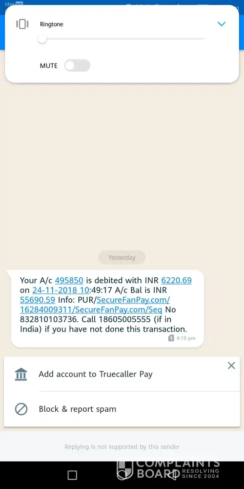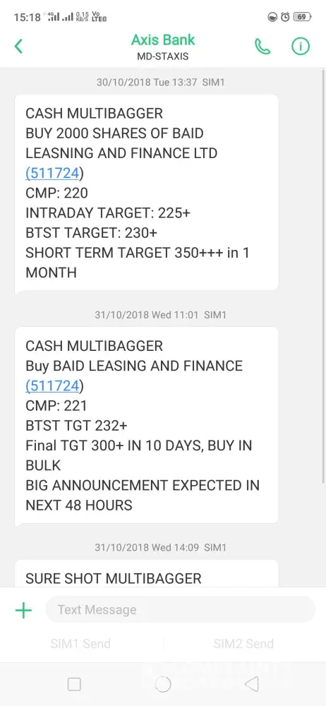 This is to inform you that axis bank is sending Fraud sms to his customer regarding share market "I got a sms on 30/10/18 and 31/10/18 that big announcement is coming in 'Baid leasing and Finance company ltd' in next 48 hrs repeatedly but noting came in next its a kind of trap because just after buying it started decreasing and can, t be sold.