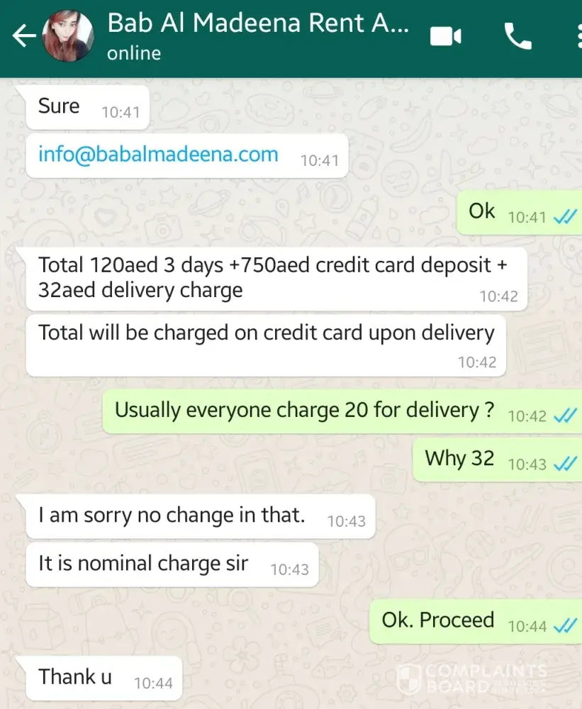 I rented a car in Dubai from Bab Al Madeena car rentals in May 2018. Found this company online and they offered very attractive price. After 10 days I returned the car in its original condition (just without disgusting cigarette smell) and was promissed to get back my deposit back to the credit card within a month. Never got it and they just ignore me now. Total amount of this scam is around 400 usd.
