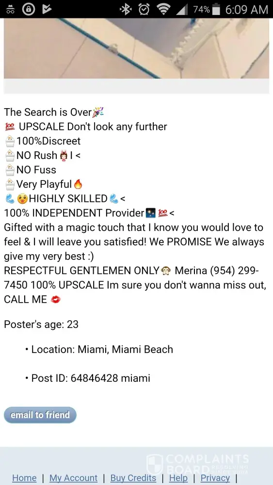 The women associated with this add is a theft! Post ID: [protected] Miami. She was extremely late when we sit up our arrangement and after when I called it off she called my phone and then convinced that she was a few minutes away so I actually listened. She then arrived with her girlfriend, who was waiting in car, came in my room, accepted my payment, and then before anything got started, she mentioned something about getting protection from her girlfriend in the car and then may a break for it, speeding down the street! How unprofessional! Karma will definitely get back! Everyone be careful when dealing with these people. Avoid this theft!