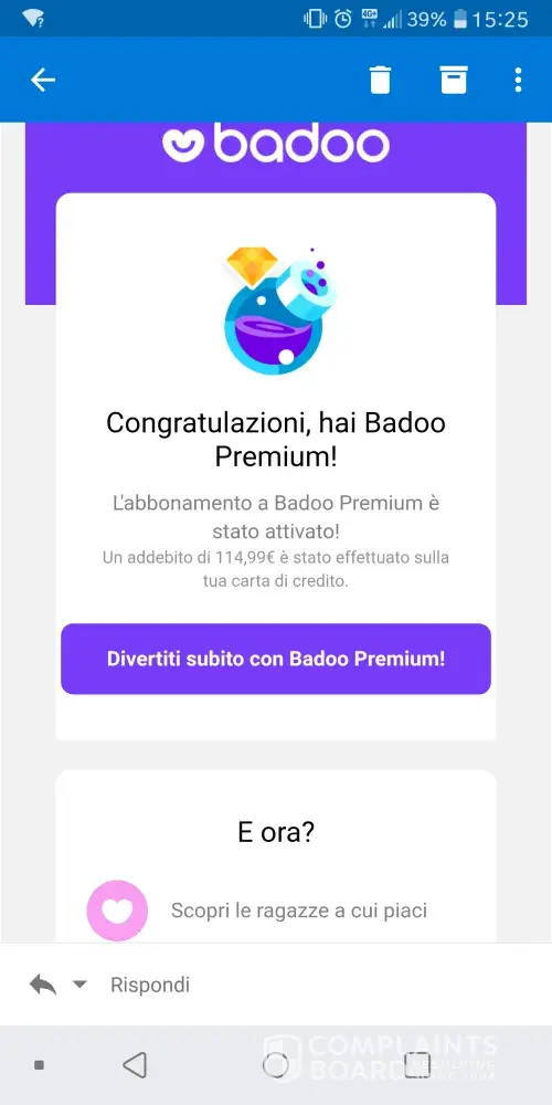 Went on Badoo and purchased a 5.99EUR pass for premium, went to see the bill for the premium and in my junk mail box saw an email saying I got billed 39.99EUR for "credits". I never agreed to buy any credits, just the 5.99EUR premium account.
