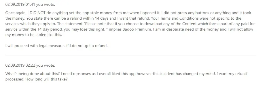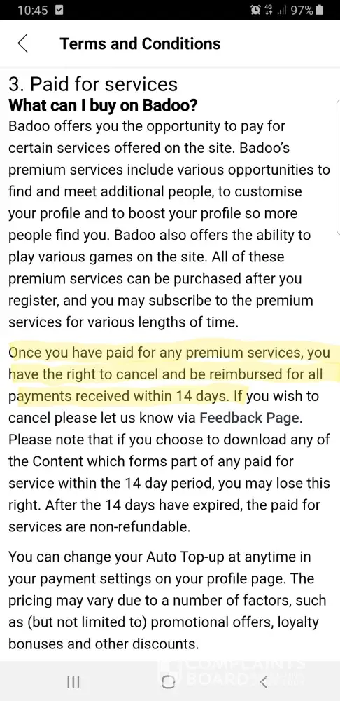 This is shameful activity. It is my statutory rights to be refunded within 14 days as it states but I see that people have not been refunded this. I have put in a complaint to my bank and will be taking this matter further and am going to cancel anything with Badoo. I wish a refund in full and any account with Badoo to be terminated