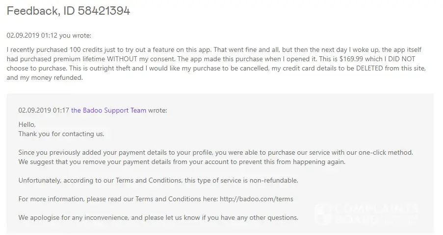 After being deleted, my PayPal payment details were subsequently automatically stored following a separate, and intended purchase. Following this, default options & pre-ticked boxes, along with one of the below were a direct cause of the unintended purchase, and as a result, Badoo Trading Limited are wholly accountable to refund paid monies.
