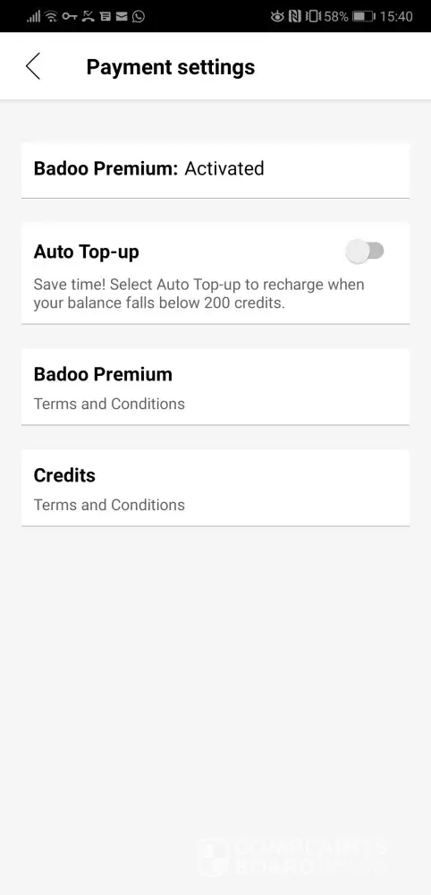 Badoo unethical behaviour surrounding default on mode of automatic top off