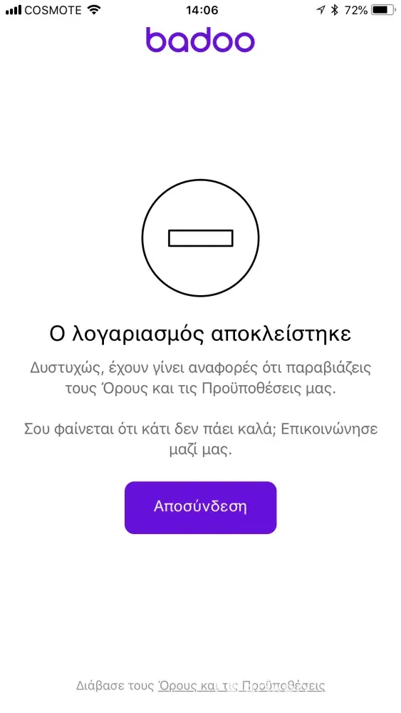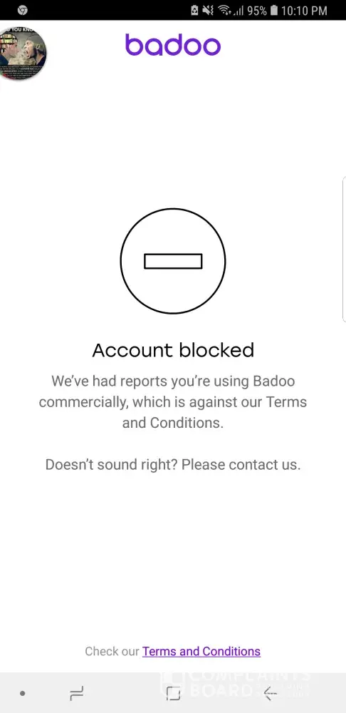 Yesterday I opened my account on badoo and it said you have been blocked for breaking terms and that I have been using my profile. Commercially...