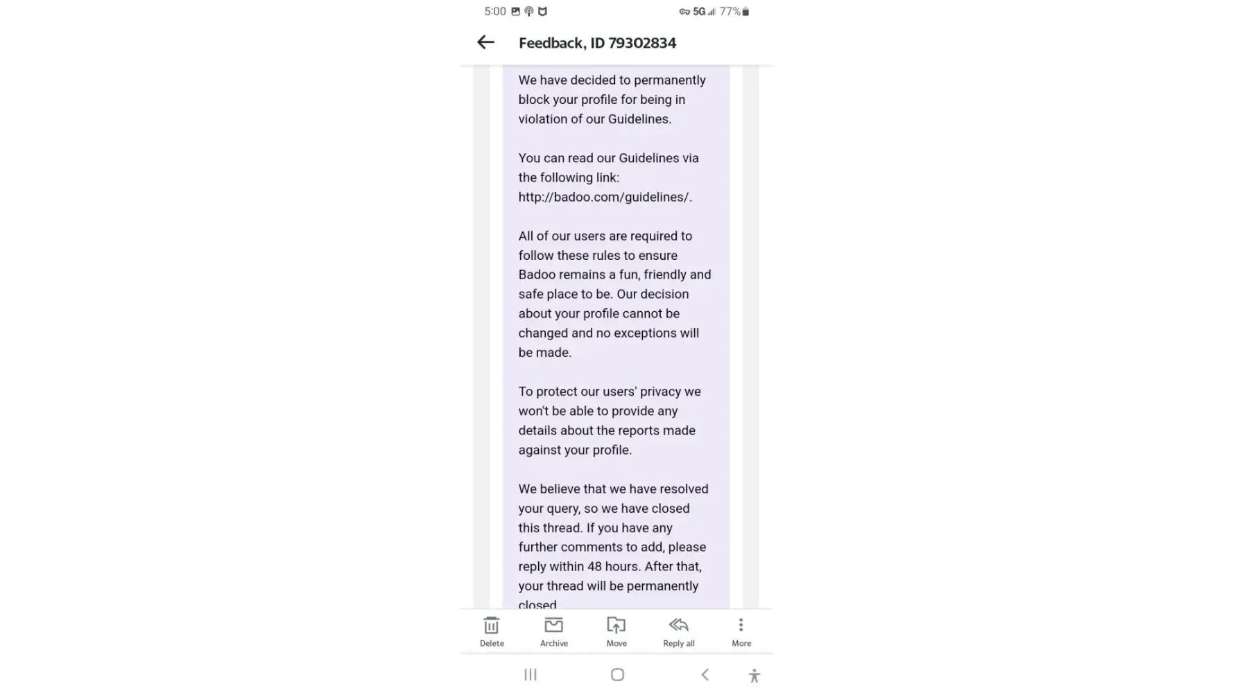 I have been reading a few of these websites that seems to be speaker of the facts of Badoo seems to be so quick to block their users without any warnings, as in my case I received no warning(s) from them about any potential or complaints about any violation just on the app and then I am slap with the message saying that I have violated their terms and have been blocked for sexual harassment. Wow funny thing is I have not harrassed anyone and anyone who have spoke to me in sexual terms I have only followed their lead and reciprocate their advances. I am clueless to who I have harrassed as Badoo don't even let you know the instance they are referring to but just blocked you. Then again if someone felt that they are being harrassed then just allow them to block that person and that's it why do you (Badoo) seems to just want to block people from them service/site/app based on one incident because one I do not sit there and harass people so I find your company stance very disrespectful and better yet harassed by your company for your behavior against your customers. I find that in my conversation someone say something to me and your message is popping up asking if I want to block/report the person for harassment now if I am not reading the message correctly I could have clicked on yes when there is no issue I wonder if your own system could even be the problem. I wonder if your company (Badoo) really investigate cases cause it seems like you all don't. On a last note remember your customers are what makes your company and without your customers you don't exist remember some large companies that are gone now so stop pissing off your customers with all these micromanagement your company is doing which seems to be a problem rather than helping your customers. Your company (Badoo) has a lot of irritated customers so what tells me is the problem is not your customers it's you. I am going to ask that my account be unblock but based on my one prior encounter with your company (Badoo) about my account you blocked prior I doibt it will be unblocked as it was almost the same thing and you said it will not be unblocked and the decision is final. I find that your company is way too quick to block people we are all adults and we can make up our own mind of who we would like to speak with and who we would like to block so if someone is being abusive leaves it to the customers to block the person cause if someone does this to who they are speaking with and everyone does it that person would have no one to harass/abuse anymore. We the customers are asking Badoo to stop this awful behavior of just blocking people with no real evidence that they have done anything wrong as it seems to be a one sided investigation and also no real appealing system of allowing someone back on with a warning or at least providing them with a warning after 3 or so or more occurrence that they have broken the rules in order to have them stop the behavior it's like like bop you break the rule then here you are block. Fix this cause you might not have anyone left to block. My email address is scarborough.[protected]@yahoo.ca. Thank you for your honest and unbias decision which I hope is a honest one but hard to say with no transparency into your company (Badoo). I have used your site for over 2 years and it seems like there is no way to use your site without being eventually blocked something seems wrong here.