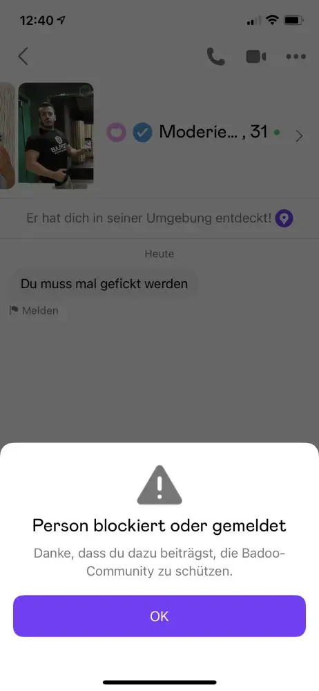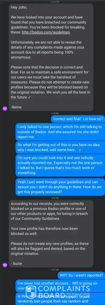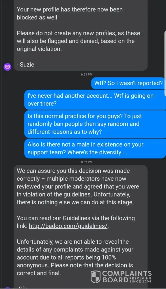 Which made no sense, I only talked with one person and we both were enjoying where the conversation went. I asked her outside of Badoo if she reported me, and explained the nonsense I was dealing with. She laughed and said absolutely not.