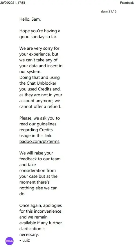You are neglecting and disregarding your own terms and conditions. In your terms and conditions, you have stated that (and I am quoting here from the terms and service conditions in your website): “3. Top-up works by adding credits to your Badoo account when it reaches less than 200 credits. You will be recharged with the same amount using the payment method you originally used to buy this service. For example, if you purchased 550 credits and enabled Top-up, you will be billed 15.75€. You can change your auto top-up anytime in your payment settings.”. Your terms and conditions did not say that you can automatically take money from my credit card to purchase (what you call) services “Chat Unblocker” (which does not exist and are not in conformity with any kind of agreements in your terms and conditions) and which I have never ordered, solely by providing my credit card details to you (as you have claimed in your last response to me in the Facebook Messenger that you have taken money from my credit card solely because i have provided your website with my credit card details even though my credit card details were not saved in my profile in your website, see the attached file showing your response to me in Facebook Messenger). It is clearly said in your terms and conditions as mentioned before that the only case where you can automatically further process my credit card details data is by enabling the auto top-up option. But, since I have disabled and unchecked the auto top-up option before proceeding with the only one-time payment that I have made (15.75 Euro only) (after entering my credit card details), and since I have never saved my credit card details to my profile in your website, then you did not have my permission, you did not have my authorization and you did not have my consent to use my credit card for auto top-up for further processing and purchasing (what you call) services “Chat Unblocker” that I have never ordered from you and which does not exist in reality and are not in conformity with any kind of agreements in your terms and conditions.