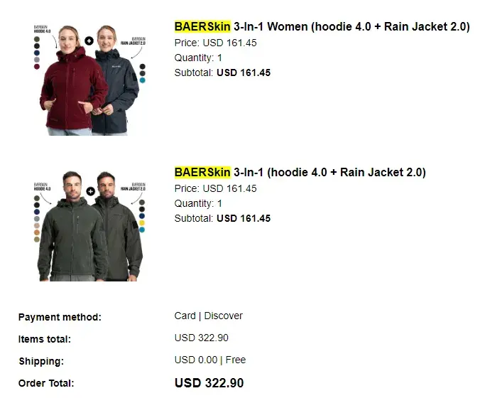 I placed an order on September 7th for a BaerSkin Hoodie and a rain jacket. I had received so many emails and pop ups on this company I was excited to order for them. I placed the order then I received two emails, one said we received your order. The second one said, "Great news your payment accepted" and then heard nothing else. On September 18th I sent...