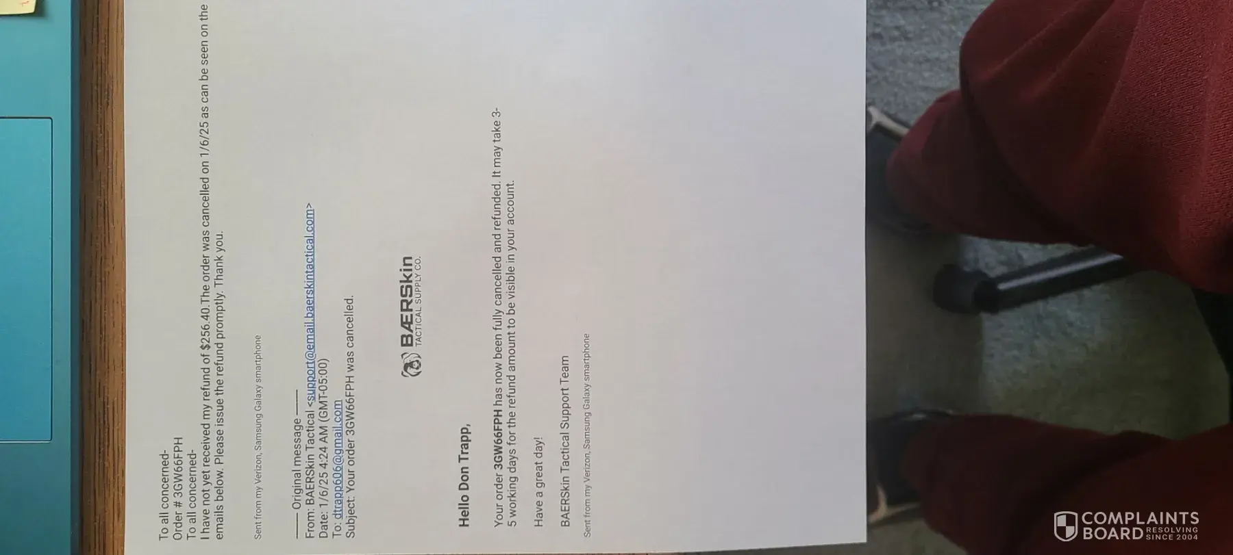 I placed an order for a Baerskin tactical hoodie and outer jacket on 12/20/24. I changed my mind about the order and decided to cancel it. I contacted Baerskin and requested the order be cancelled on 1/4/25 and they cancelled the order on January 1/6/25 (copy of email attached). At the time they stated in the email that a refund would be issued which would...