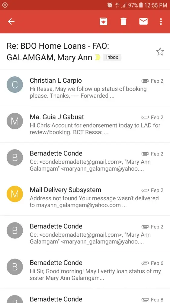 My sister, Mary Ann C. Galamgam who is an OFW applied for a home loan last year to BDO Newport Office and she appointed me as her Attorney-in fact. Last year we were able to complied with all the requirements and paid the necessary bank fees except for the 2018 Tax Clearance because Registry of Deeds doesn't want to issue one so we have waited until 2018. Last January 25, 2018 we received acknowledgment receipt for all the compliance that are lacking and confirmed on the additional documentary stamps tax due to Tax changes. I was able to confirmed in the e-mail came from Ms. Maria Theresa B. Reyes. However from then on I haven't received any information or what on the status of my sister's loan. No one from the group could even bother to reply my e-mail except to Sir Christian Carpio (who has giving false hope). I have been calling Ms. Reyes but not one did she bothered to answer my call or e-mails to her. Please help us. Give us at least verified information on the status of my sister's loan or at least give us the waiting time.