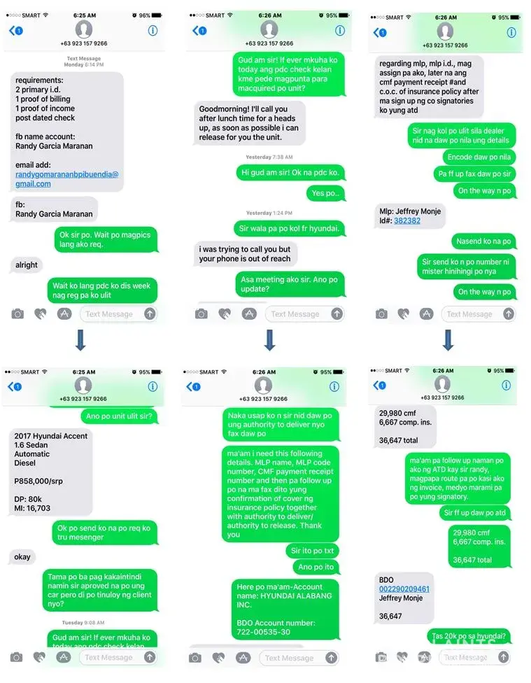 I, Paul Cezanne T. Ceriola and my partner Ann Catherine M. Empleo would like to seek assistance regarding a possible fraud transaction we had with a certain Randy Garcia Maranan who claims that he is a BPI Makati Auto Loan officer. He contacted us last Monday saying he got our number from the Facebook car loan and assume balance car Ad inquiry. He offered us to assume a pre-approved Hyundai Sedan from his client who backed out and to deposit the Down Payment to BDO accounts : Hyundai Alabang Inc and Jeffrey Monje for the car to be released.