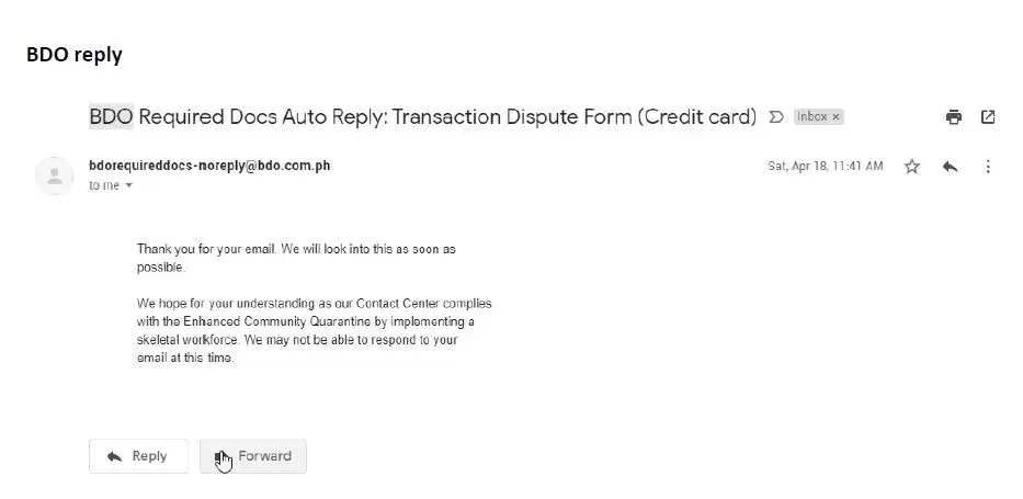 I received a follow up mail on May 8 regarding my dispute and informed me that it will take 120 banking days for a resolution, I do understand that major regions and cities are at lockdown at that time but I was quite surprise when we visited our local bank on June the report that I filed on april are not processed and so I filed for yet another dispute form which they said will take another 60 days and notified me that I will receive an email once investigations are done, 60 days and I still haven't received anything so I visited the bank twice on months of Sep-Dec but said that no one on the credits/investigators department followed up the matter,