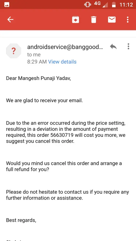 I have ordered Aluminium mobile holder for my two wheeler in Banggood on March 04, 2019 and paid full amount using internet banking.