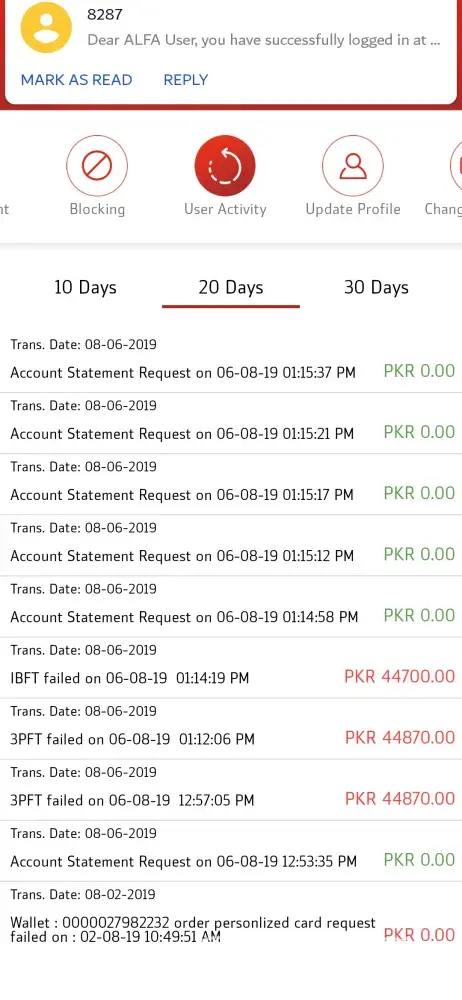 Now when i was paying my credit card bill, Alpha app process every thing e.g: log in, go to cards, select credit card, click on full payment, click on pay now, but then says, " Sorry we are unable to process your request". The same thing happens when i log in from Laptop via online banking. This problem is happening since 15 days. I have written more than 10 times in the live chat section and emails to bank alfalah provided emails many times but Alfalah isn't responding. If both forms of online banking aren't working how am i supposed to pay my credit card bill ?