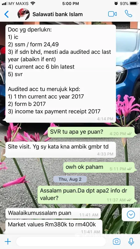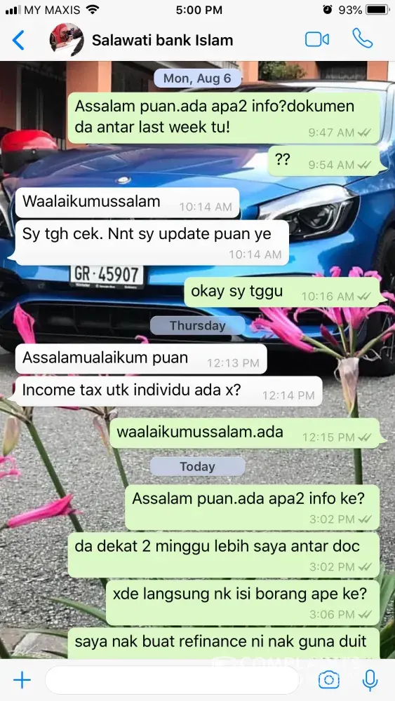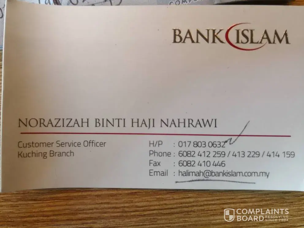 Saya Puan Maziah Mohd Ali mempunyai akaun home loan dengan Bank Islam.Pada 1 August 2018, saya ada bersama suami ke cawangan Bank Islam Seri Manjung Perak untuk pertanyaan berkenaan refinance home loan.Kami berjumpa dengan Personnel Pn Nor Salawati Mohamad Said (Assistant Manager Seri Manjung Branch) dan membuat pertanyaan berkenaan refinance.Beliau pada mula melihat rekod kami dikomputer dan yakin kami bole proceed dgn pemohonan.Cuma beliau agak mengeluh kerana pemohonan saya kali ini menggunakan akaun syarikat sebagai dokumen pendapatan.Tidak seperti sebelum ini saya gunakan slip gaji lebih mudah utk diproses mengikut kata personnel tersebut.Banyak proses & paper work kononnya.Beliau arahkn saya utk whatsapp gambar terkini rumah.Semua dokumen saya telah sediakn dan email kpd beliau pada hari berikutnya.Kebetulan hari yg sama saya ada juga submit permohonan refinance dgn Bank Rakyat.Selepas whatsapp saya menunggu hampir seminggu utk Pn Nor Salawati whatspp saya untuk feedback berkenaan pemohonan tetapi tiada apa whatsapp diterima sehingga saya terpaksa whatsapp & bertanya sendiri kepada beliau.Beliau memberi alasan sedang bercuti & balik bercuti akn semak dokumen.Sehingga lah pada Khamis 9 August beliau bertnya berkenaan income tax kemudian kembali senyap tiada jawapan atau invitation utk saya isi borang & sebagainya.Selasa 14 August 2018 saya mendapat maklumbalas dari Bank Rakyat refinance saya lulus & saya agak hairan kenapa sehingga itu Bank Islam tiada jawapan.Saya akhirnya whatspp Pn Salawati berkenaan status refinance saya & akhirnya baru beliau call saya & menyatakan pemohonan refinance saya gagal dengan alasan monthly income tidak layak untuk pemohonan refinance.