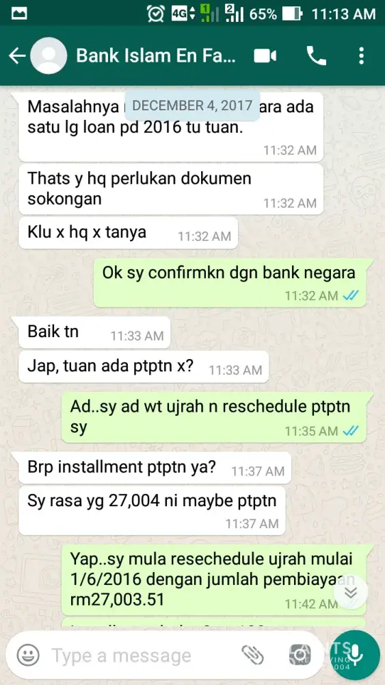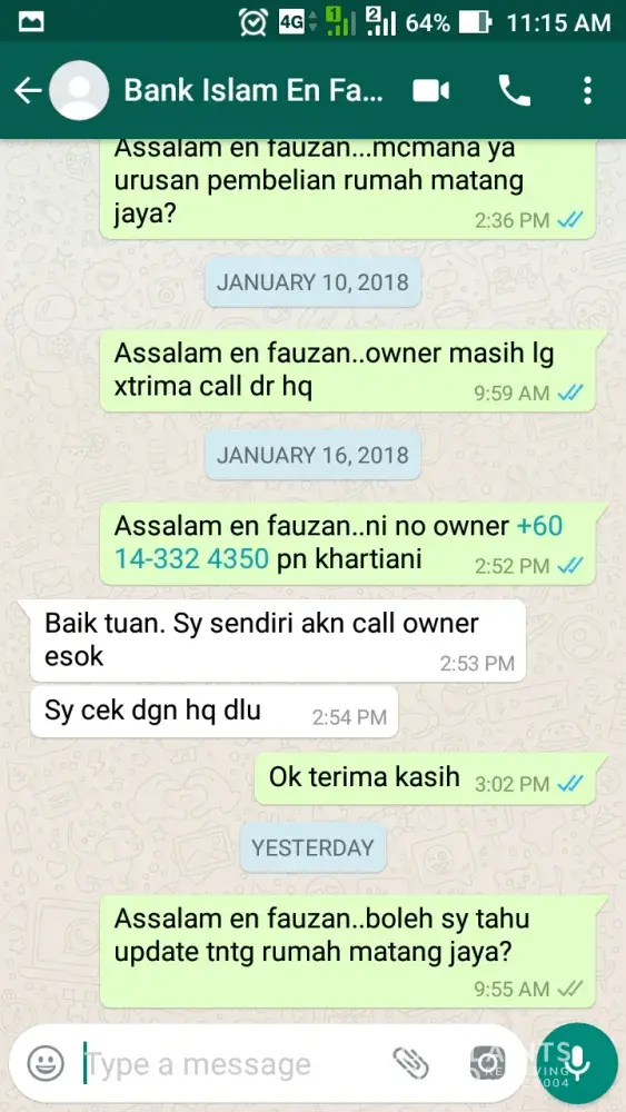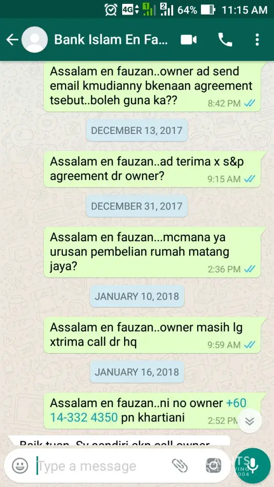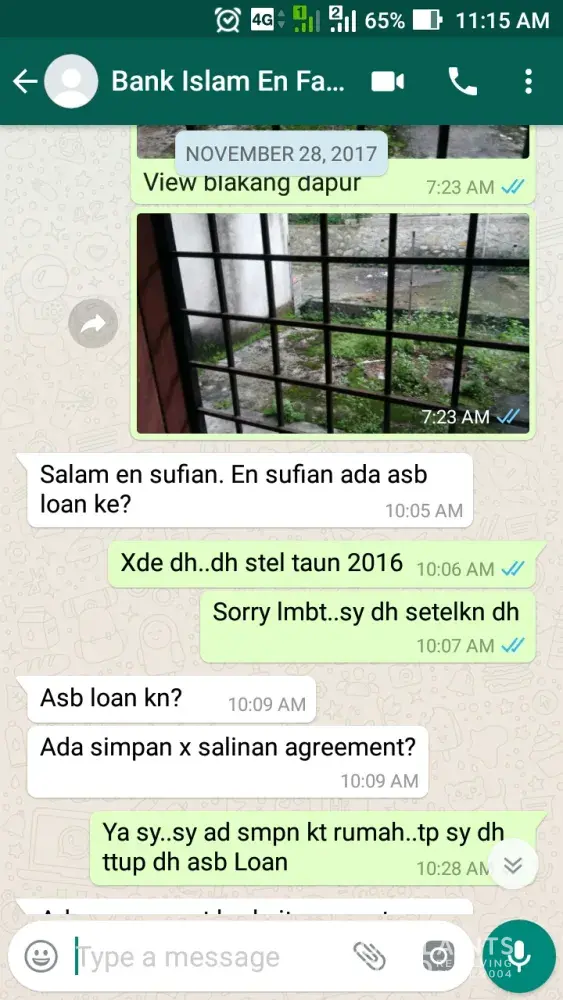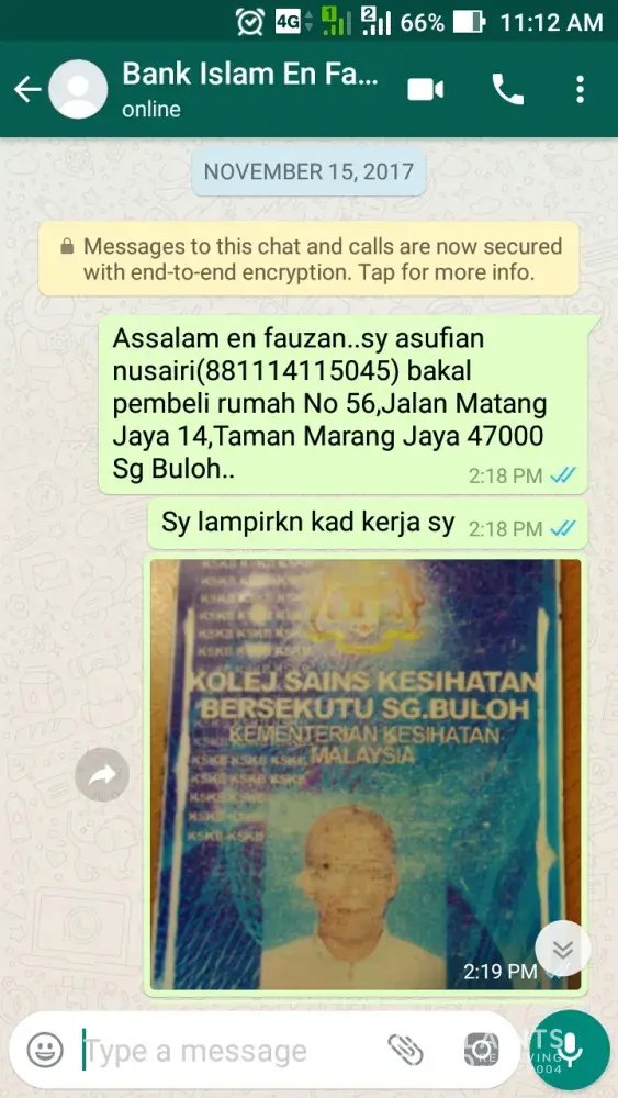 Sy asufian dr sg buloh (+[protected]) ad apply housing loan ntk rumah d matang jaya d bank islam rawang.. personnel tesebut iaitu encik fauzan maarof y mguruskannya.. bermula dr 15 november 2017 (lampiran disediakan dlm bentuk image) sy apply n cuba bg kerjasama dgn attach smua dokumen y xlengkap mlalui whtsapp.. pd 28november, fauzan whtsapp sy (lampiran disediakan dlm bentuk image) btnyakan sy tentang asb loan y telah sy tamatkn n insist ntk sy dptkn details asb loan y telah lama sy ttup sehinggala dia menyedari kesilapan dia y menganggap sy ad asb loan sbenarny sy ad ptptn loan pd 4 december (lampiran disediakan dlm bentuk image).. disebabkn kesilapan dia telah melambatkan prosedur pinjaman selain mnyusahkan sy utk contact rhb bank bkenaan details asb loan y tlah ditamatkn.. selain itu sikap dia y langsung tidak membaca whtsapp (xbluetick langsung) dr sy bermula dr 13 disember hingga 16 januari 2018 (lampiran disediakan dlm bentuk image) menyukarkn sy mendapat sebarang update shinggalah pd 16 januari sy telah call n dijanjikan oleh fauzan ntk call owner rumah tersebut (lampiran disediakan dlm bentuk image).. sehingga hari ini masih tiada call y diterima oleh owned drpd pihak en fauzan (lampiran disediakan dlm bentuk image).. sy tawar hati berurusan dgn pihak bank islam d atas sikap kakitangan ini y bernama fauzan maarof