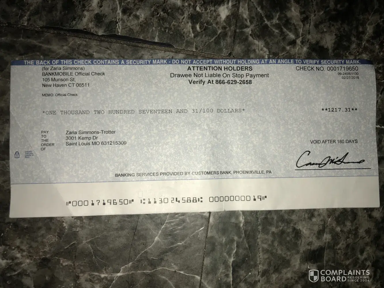 So I've been calling Bank mobile multiple times because they are not all Saying different things with the With the same situation I've been doing with Bank mobile for about three weeks now probably even more because first off I received the check in the mail I go & verify my check at walmart and they verified so it can be cashed and Walmart can't send a check denied so I called Bank mobile that same day and they're saying oh you can't use Walmart system to cash a check so I'm thinking why didn't you guys say that when Walmart first called you and let them know it was Walmart that was trying to cash a check then I called back again the next day and they are telling me that I cannot cash the check anywhere else because Walmart has verified already but but I didn't know that Walmart wouldn't be able to Cash because of the system which you guys at Bank mobile were telling me that, so then I called again the next day and I talk to a man on the phone and he said that I'll be able to deposit the check into my Bank mobile checking account so he put in a request three days ago for me deposit it is it OK just wait 24 to 48 hours and it will be in your account so I waited 24 to 48 hours and there was no check in my account so I called again today and the lady I spoke to on the phone I believe her name is Paige she said there is no request in the system for you to get the check deposited in your account but all requests we have in your account it'll send you a replacement check and I didn't request from the replacement check I requested for the check to be deposited into my account I can't keep depending you guys to say the correct thing because when all of your bank mobile people are telling me different things and I have missed Out on paying my bills because of you guys are playing around with my check I don't have time to keep playing with you guys And y'all are telling me to return the check back to you and wait again for another whole seven days to receive the check so today I'm going to let you guys know if I don't get the money I'm going to be basically going to be telling everybody about how you guys run your System and that your workers are not stand correct thing to their customers and I'm going to court .