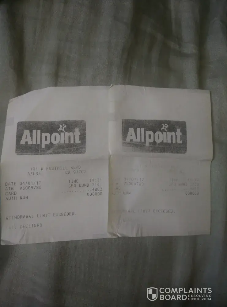 This occurred a couple of months ago so at a Target is Azusa CA. I tried to withdraw money using the allpoint atm machine there. I had maybe a $1300 or 1400 dollars, I don't quite remember the details. Anyways I tried to take out $400.00 it didn't work and tried again and again using different amounts from $100.00-300.00. I thought then maybe the atm was out of money. So I looked up another atm machine at the cvs next door. Same thing happened. From all those times I tried, all I got were receipts for "withdrawal limit exceeded" (picture below). I go back to my car and check my account. Bank mobile charged me. I made complaints for each transaction. They then gave me temporary credit after having a lot of trouble with their customer service. I took the money out and put it into my personal account. I've always taken out all the money and put it into my personal account because I've read the reviews and wanted to avoid something like this. When they resolved my complaints, they approved only 4 out of 5. The one they did not approve was for $100.00 I've been receiving notifications that they will report me to credit companies etc. DO NOT TRUST BANK MOBILE! Take your money out and put it somewhere else! I feel helpless and I'm going to pay the money I supposedly took back because I am afraid it will affect me in the future. We have enough problems as students. Please listen to everyones complaints.
