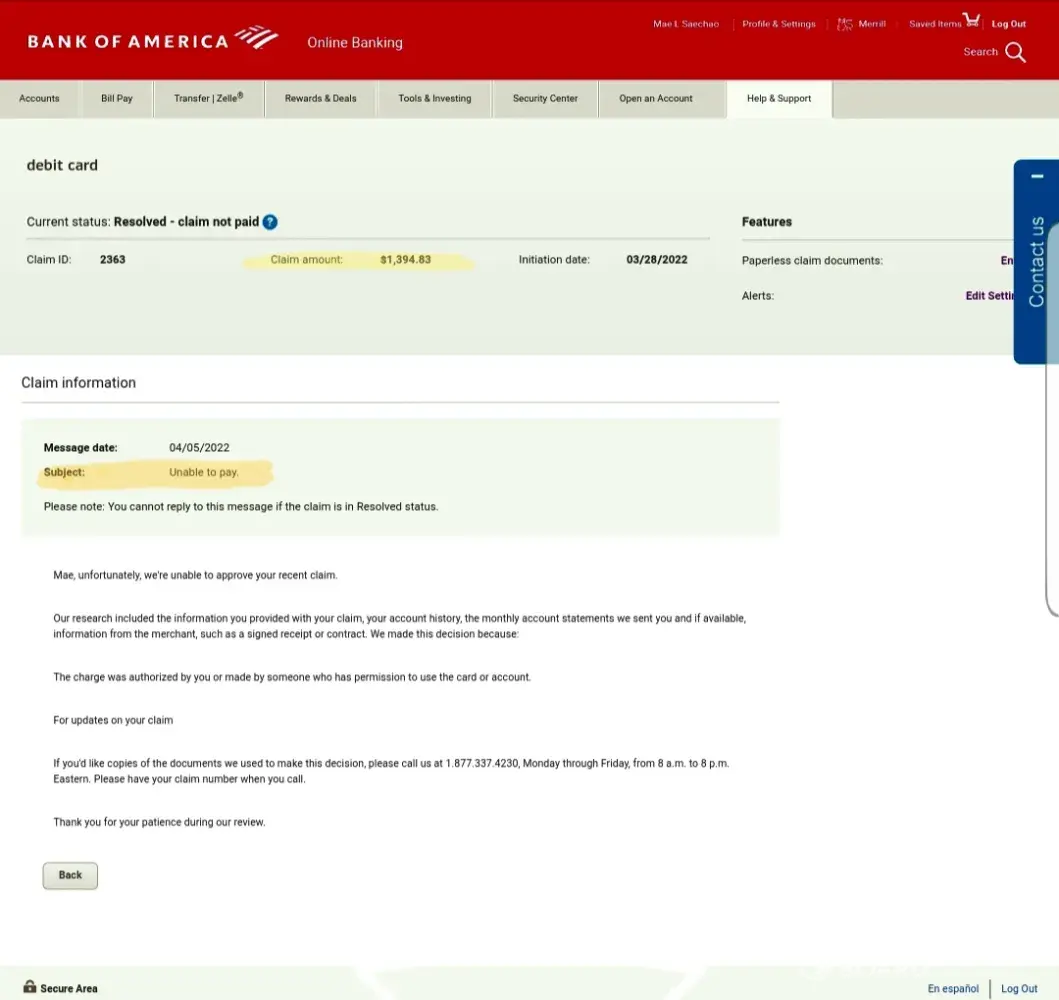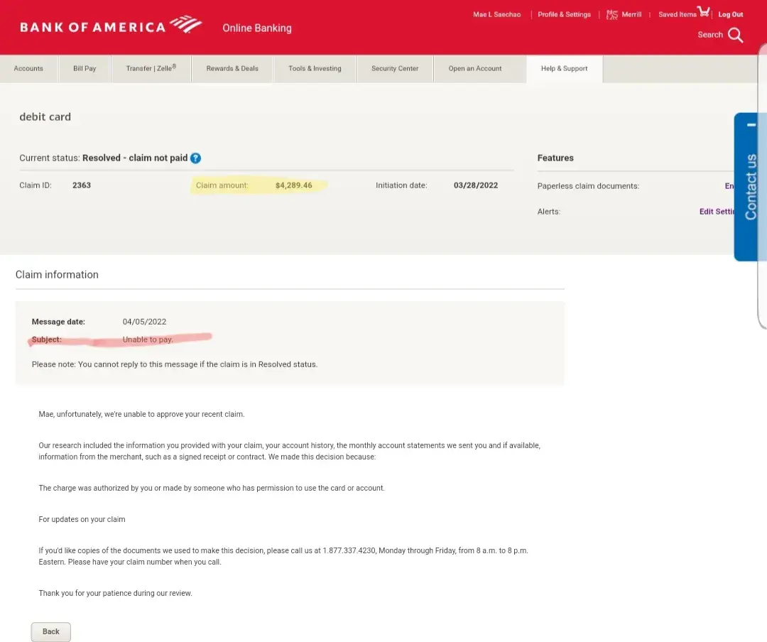 Bank of America EDD denied credit adjustment, they said I changed account information. That is not true, hacker did log in my account.