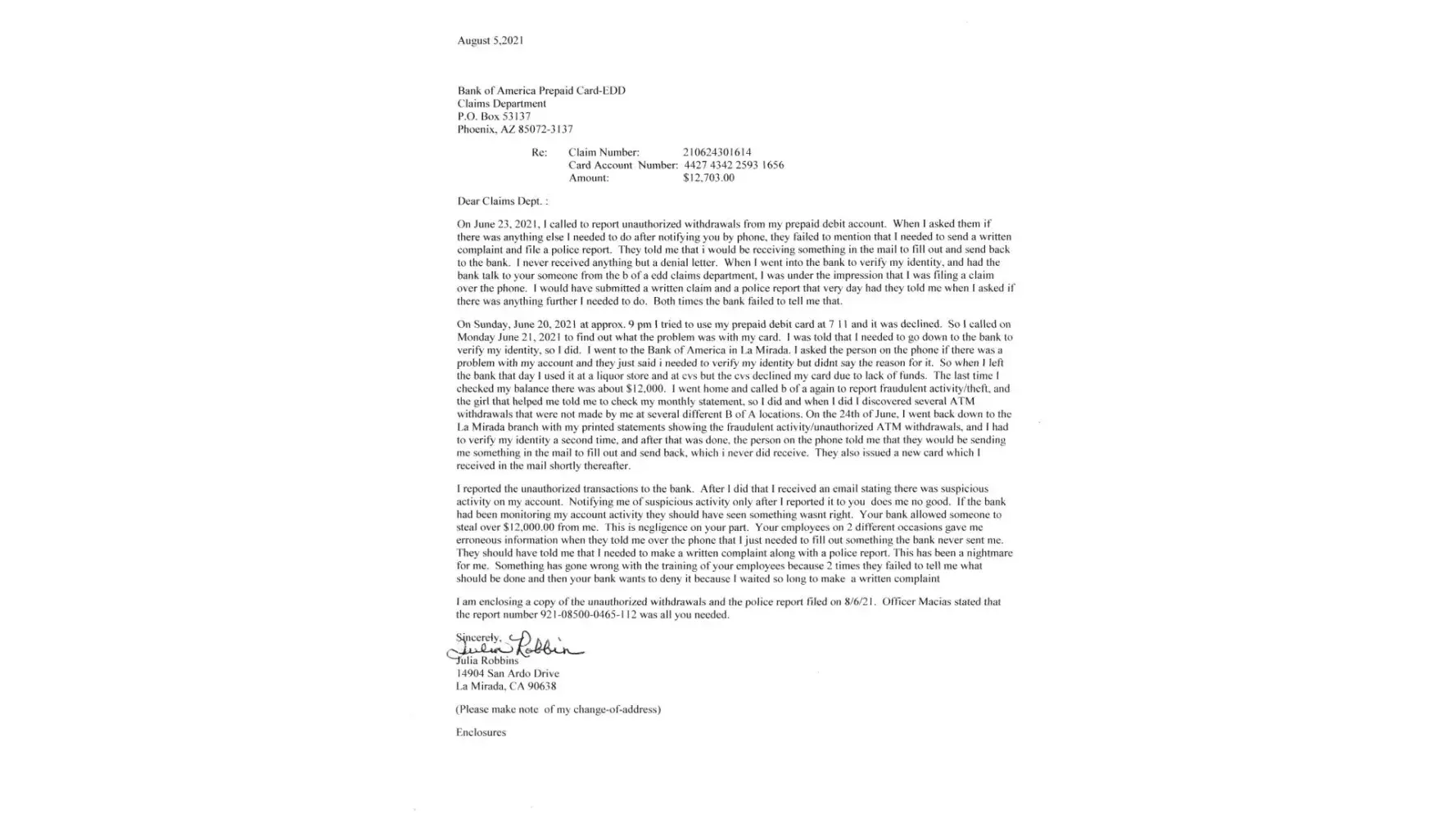 I am enclosing a copy of the unauthorized withdrawals and the police report filed on 8/6/21. Officer Macias stated that the report number [protected] was all you needed, which was incorrect information so I am now submitting a copy of the police report.