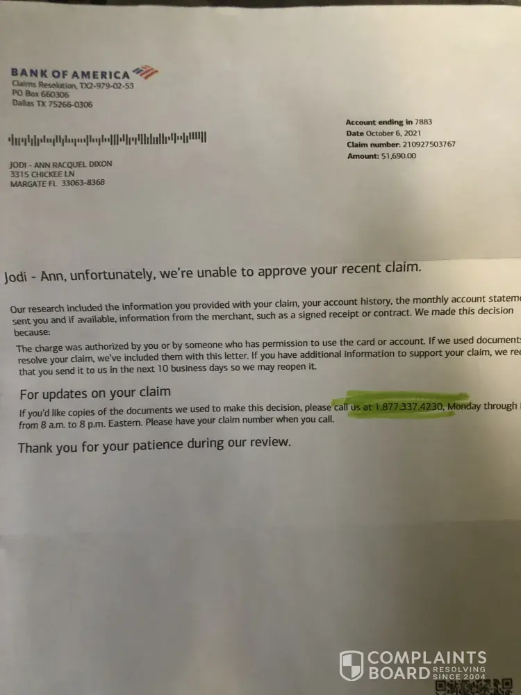 Bank of America Claim Number: 08JAN2021-160318