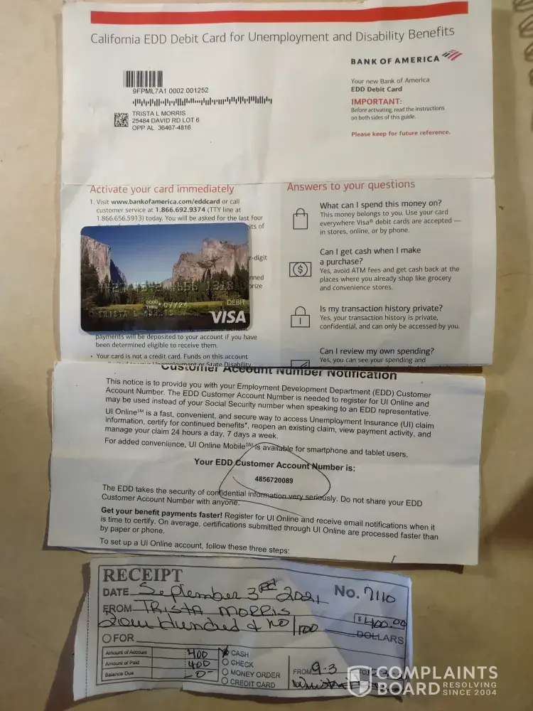 I went to Bank of America and EDD proved my identity 4 times got large money each trip. And September 6 202+ they gave me western union for $3000. I can't get threw EDD all personal information changed and I am in Alabama where they sent my Debit card only month old sending new one I. My name and to stranger address I stop debit card I have call email everything they have till September 24th 2021 get my new debit card or San Francisco News per and US legislation got cpy.Thanks Trista Morris email [protected]@gmail.com