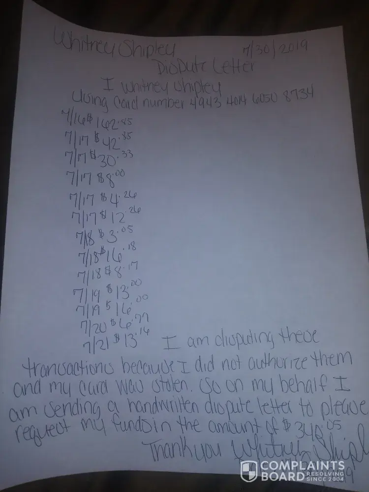 My card was stolen and i did not authorize anyone to use my card or spend my funds i have kids and my utilities are off i have a 2 month old ive been calling begging still no luck at all i need some financial help ASAP...Here is my hand written dispute letter with my signature and details, and i WHITNEY SHIPLEY Did not Authorize or give anyone permission to use my card and i would really appreciate if they put my funds back while investigating the errors please today my utilities have to be paid and my situation is so un fair and