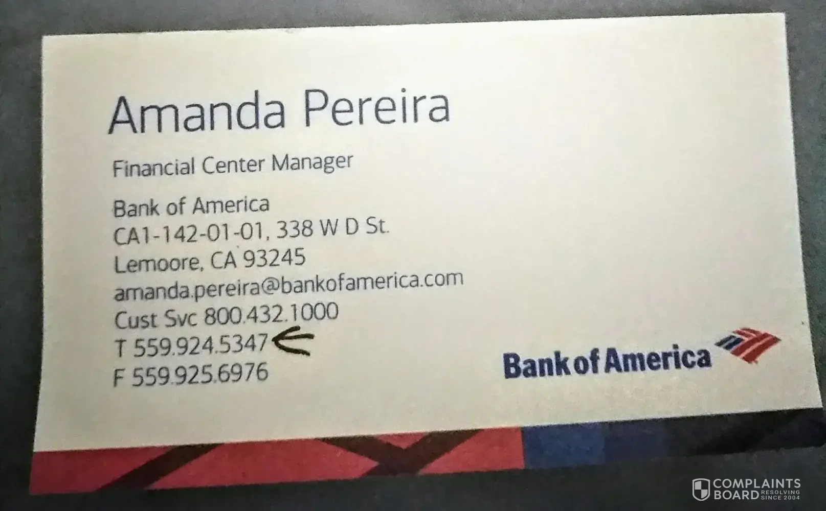A very friendly teller advised I call a particular direct line at B of A for further follow up. I was also given a business card with the name Amanda Pereira. I came home and started calling my old financial institution as well as Social Security. This was logical follow up to make sure the funds did not flow into my old bank. I was on hold for Social Security and was advised it was a 1 hour 15 minute wait. So I called your Central customer service quickly because I can always get through. I was checking to see if they saw any pending transactions or if they had any other advice. They suggested I may have a problem because the name on my Social Security has been updated to my new married name (Cole). B of A has my previous name Murphy on record because I'm waiting for my DMV appt. They advised me to take my marriage certificate to the branch just in case. I decided to call first because I am not in great health, 65 years old, and it's 101°. So my husband and I came in and come to find out Amanda Pereira is not only the branch manager, but also the person who HUNG UP ON ME when I called! She admitted that in front of Alphonso, a teller and all the customers in line behind me. I asked why she did it and she said I was talking over her. No that is not anywhere near the truth. She kept talking over me telling me to call SSA, my old bank, the central customer service number. I told her I was trying to answer her ridiculous question which was : how do you know you have given SSA the correct routing and account number? I had the form in front of me that I used to update direct deposit, as well as the name of the person I finally spoke to at SSA to confirm I had the right data. I asked Amanda why can't she stop talking a minute so I could answer her uninformed question and she flat out hung up on me! What's worse, she refused to answer the phone 6 times that I called back in! So I asked my husband to drive me back to the branch and that's when she identified herself as the rude employee of the bank who hung up on me and ignored me, where I pay to keep my money! She ultimately apologized that I "got upset". I said don't you owe me an apology for your rudeness and total lack of customer service? She repeated herself, sorry I got upset. Like I just out of the blue got upset, nothing to do with her! I asked her to apologize for hanging up on me and out of her BIG heart, she did. Now how embarrassing for other customers hearing it, for the teller (that is after all, his manager!). And, this is your caliber of people in management? Maybe because B of A is deserting Lemoore, she doesn't give a damn how she acts! My husband was completely livid and had to go outside because he was so angry.